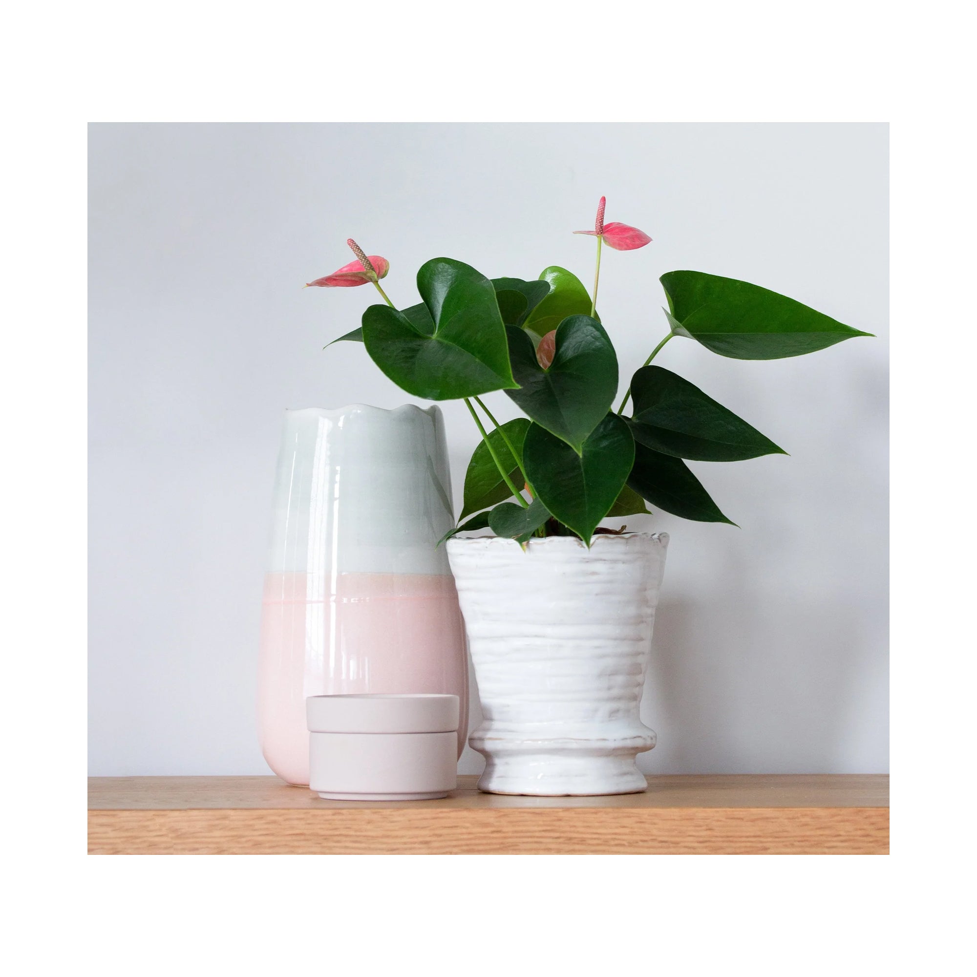 Use a simple pot to display your vibrant plats! Made of ceramic with a cylindrical form, a shiny white glaze, and a base designed with a brown finish. Fill it with vibrant flowers or with lots of greenery to add nature and beauty to your space.