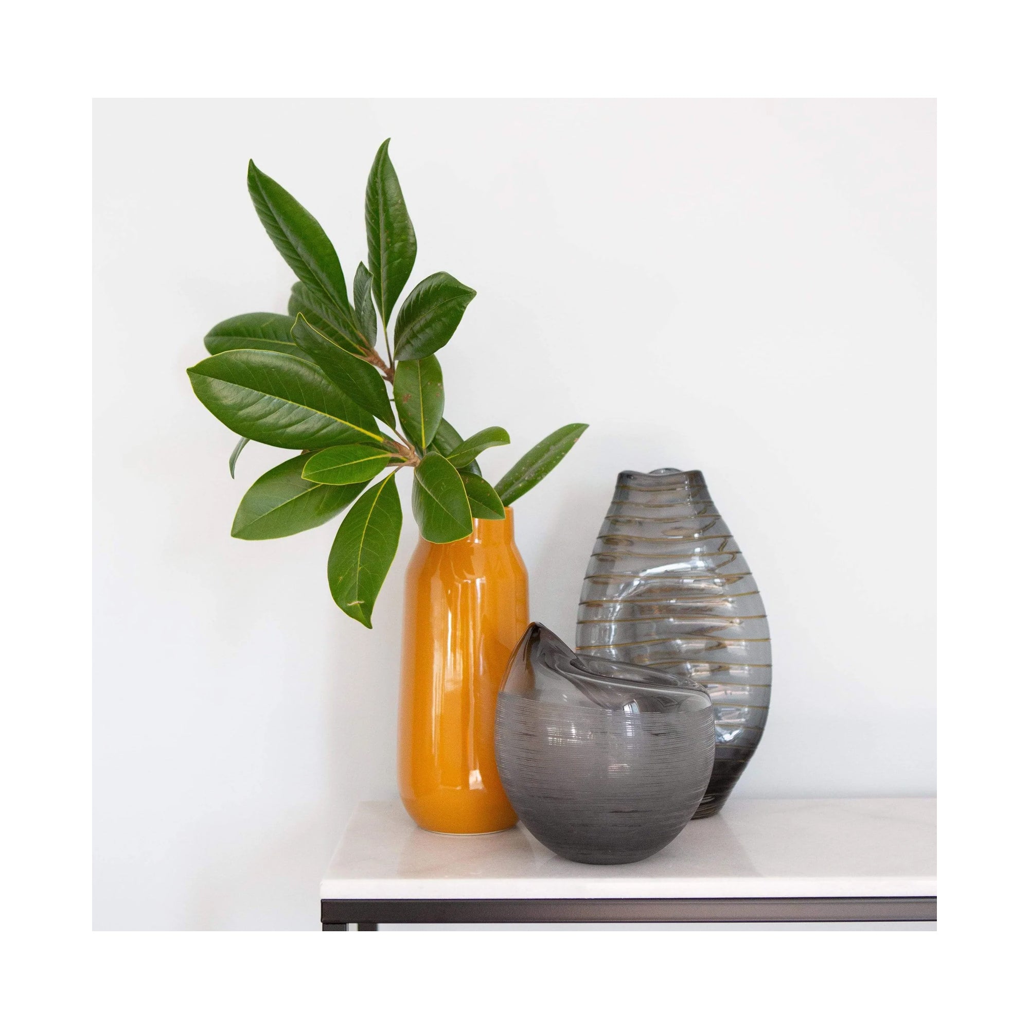 A beautiful artisan-crafted twisted glass vase, in blue with an amber line fused into the design.