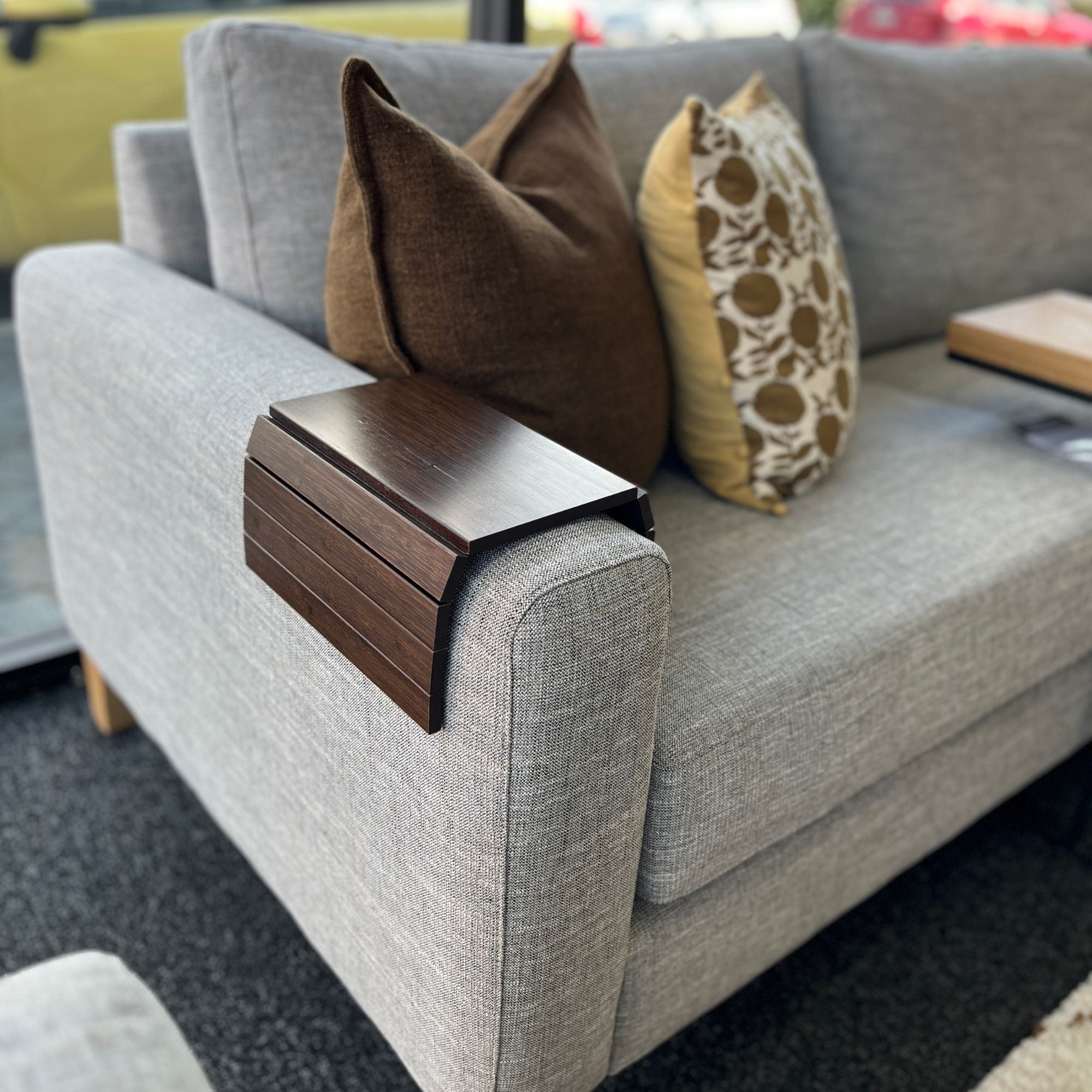 The Wenge Slinky Sofa Table sits over your sofa armrest. A convenient alternative to a side table, it's the perfect spot for your cup of tea/coffee and a good book!