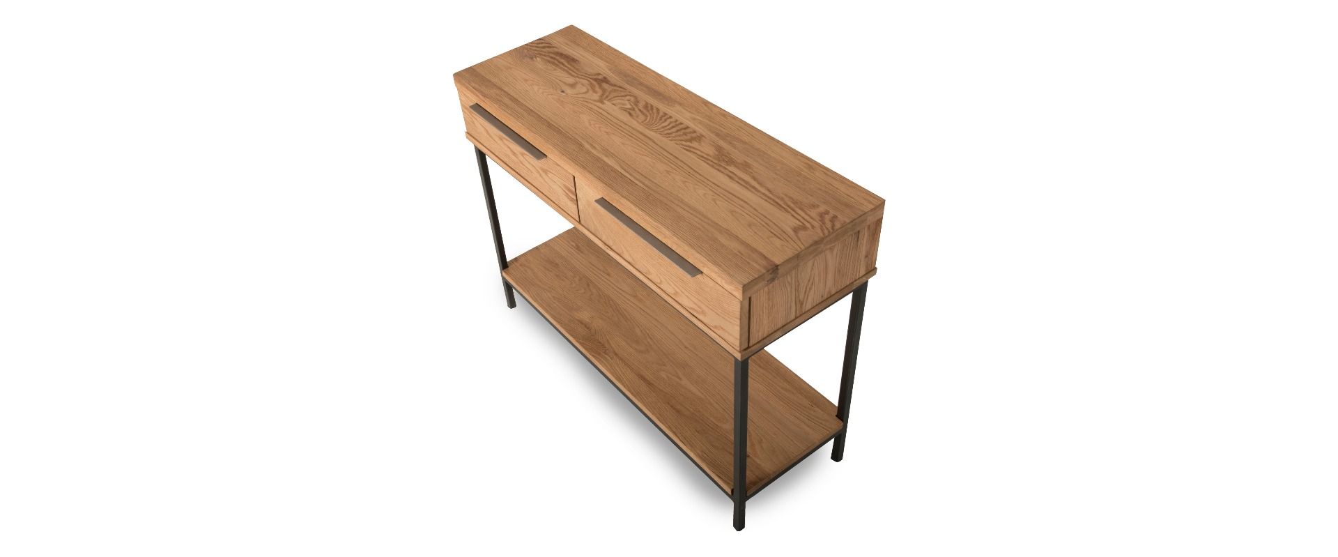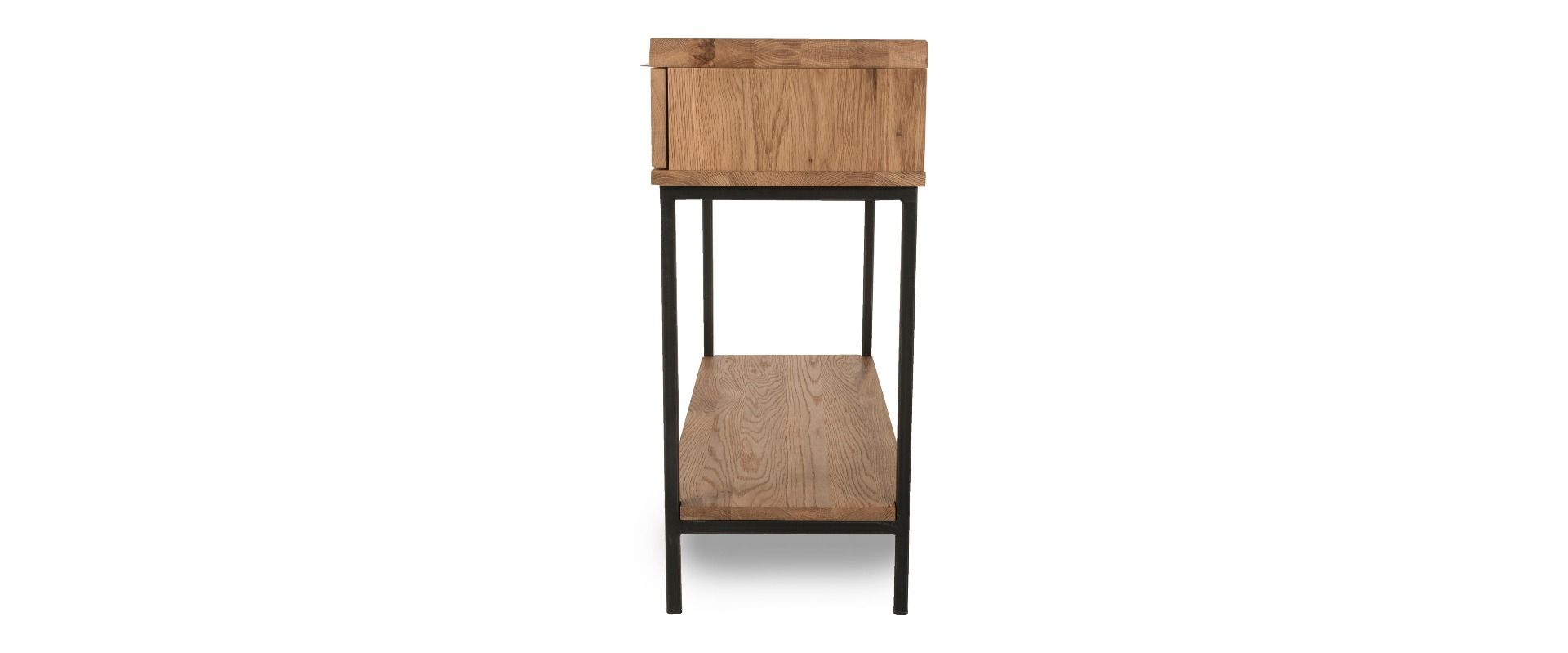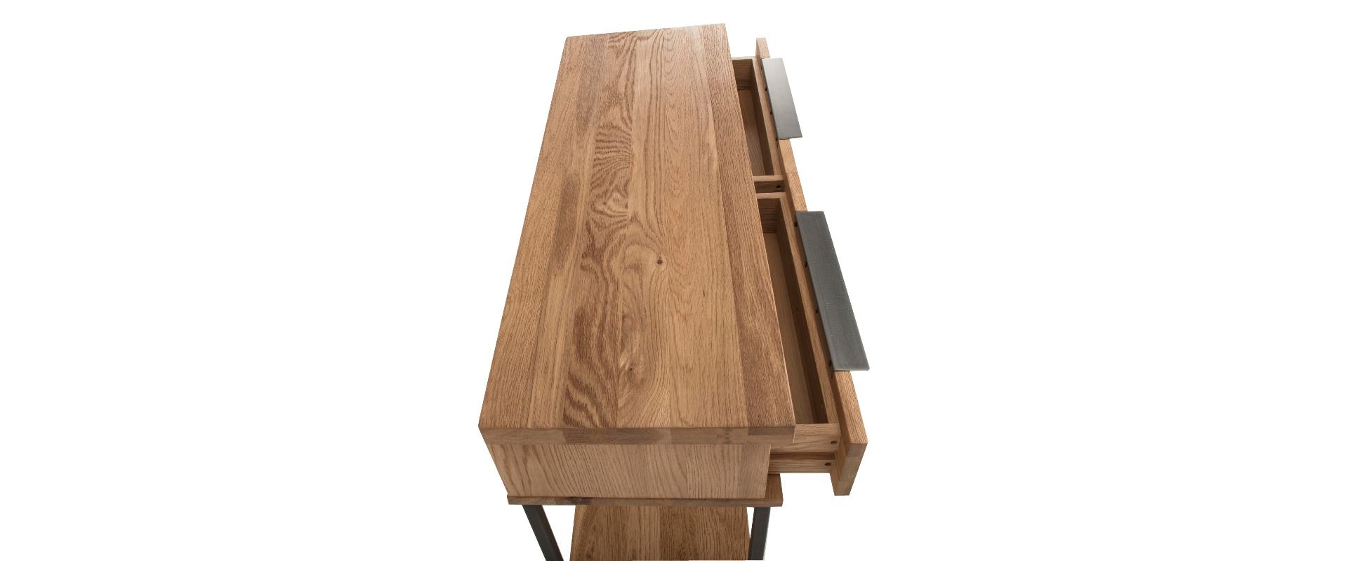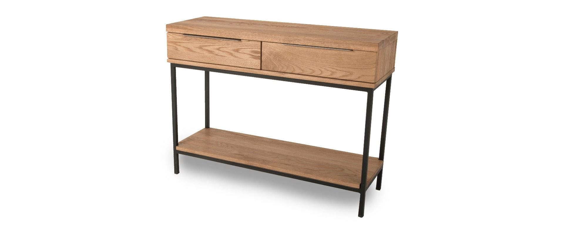 Add some industrial chic to your entrance- or hallway with the Calia 2-drawer hallway table. This piece is crafted from solid American white oak timber with a brushed, natural oil finish combined with a distressed metal frame. The two spacious drawers provide ample storage space keeping your hallway clear of unwanted clutter.
