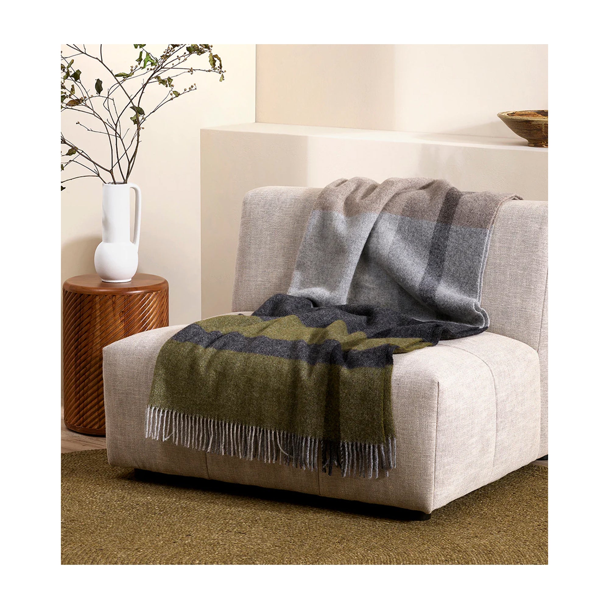 Featuring an offset plaid design, a modern take on country style is celebrated in this luxurious, pure wool throw. Crafted from New Zealand-grown wool, the timeless design and rich olive tones create a reassuring sense of warmth and comfort. Each throw is finished with a traditional twisted fringe.