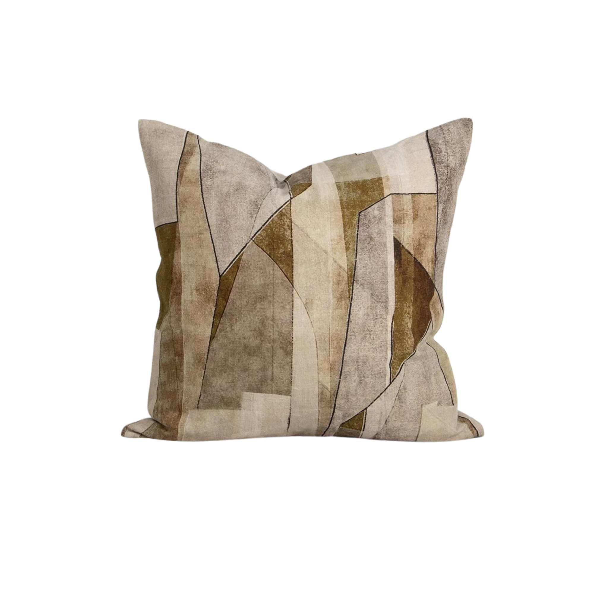 Inspired by the fine delineations of fractured rock strata, the Grove cushion makes a subtle statement in a palette of green, mushroom and taupe. Printed onto a natural linen base, the abstract surface design adds a refined, geological narrative to living spaces. Style with complementary stone and forest tones.