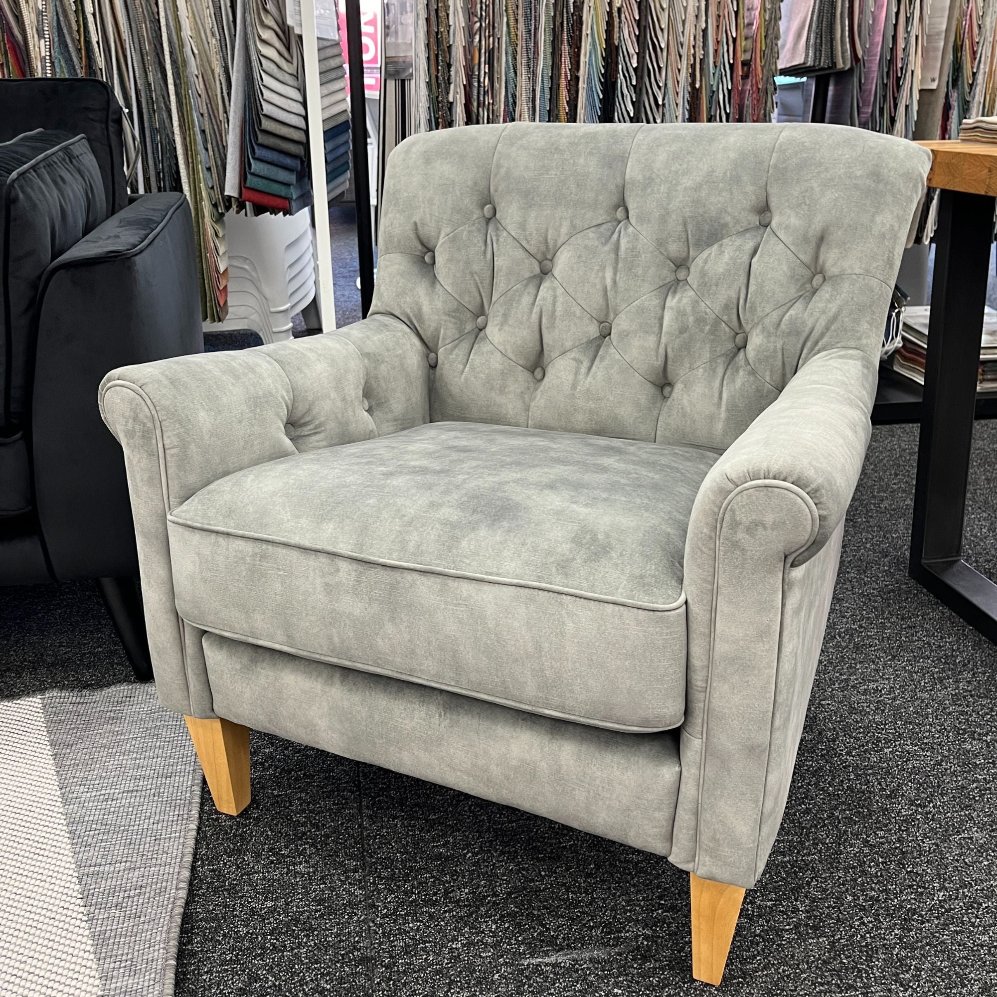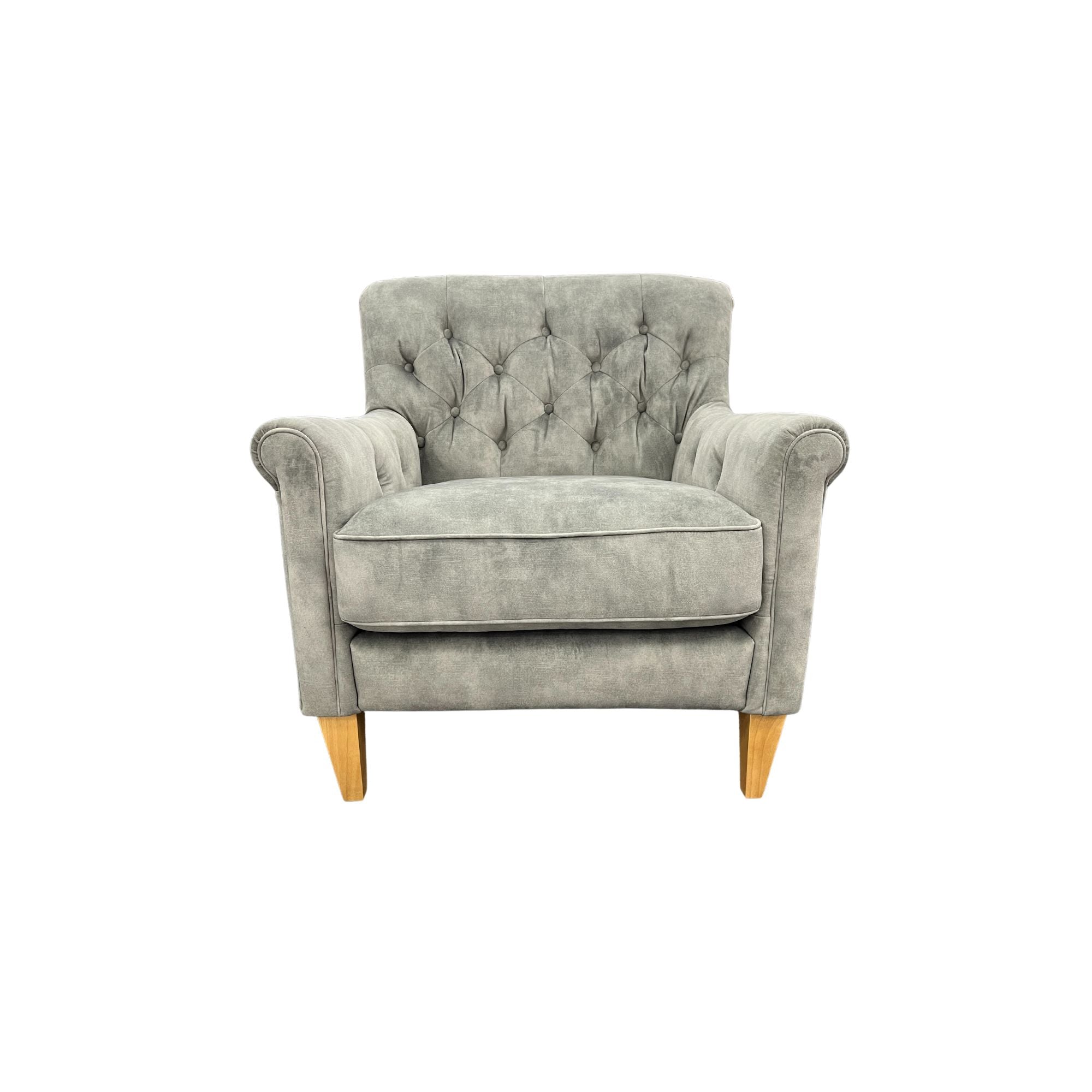 The Captain's Club Chair in Urban Sofa Misty Grey Velvet fabric with natural legs is perfect for making a statement in any room. The deep buttoning adds a touch of elegance, while the natural legs bring a modern style to the chair.