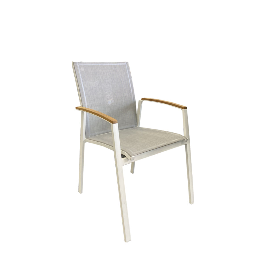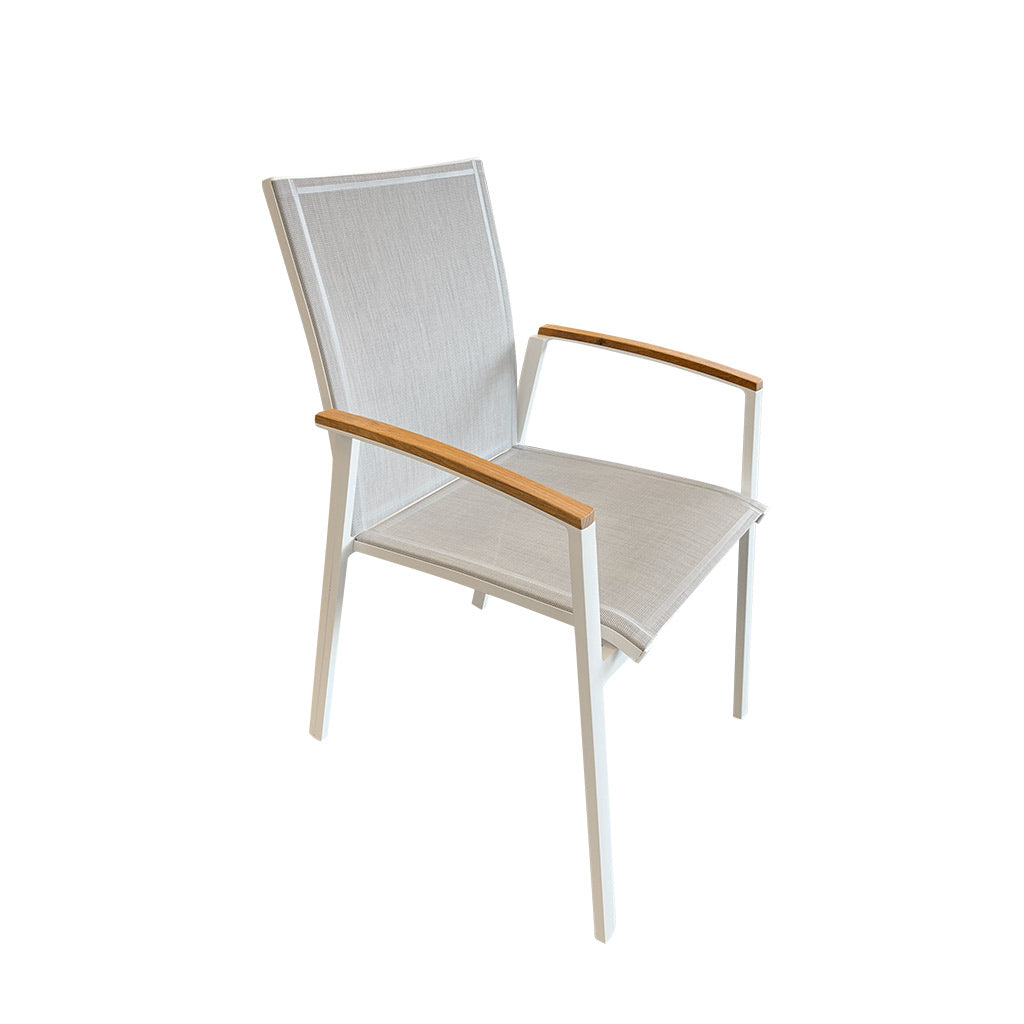 The white Cairo outdoor dining chair features powder-coated aluminum with teak timber arms.