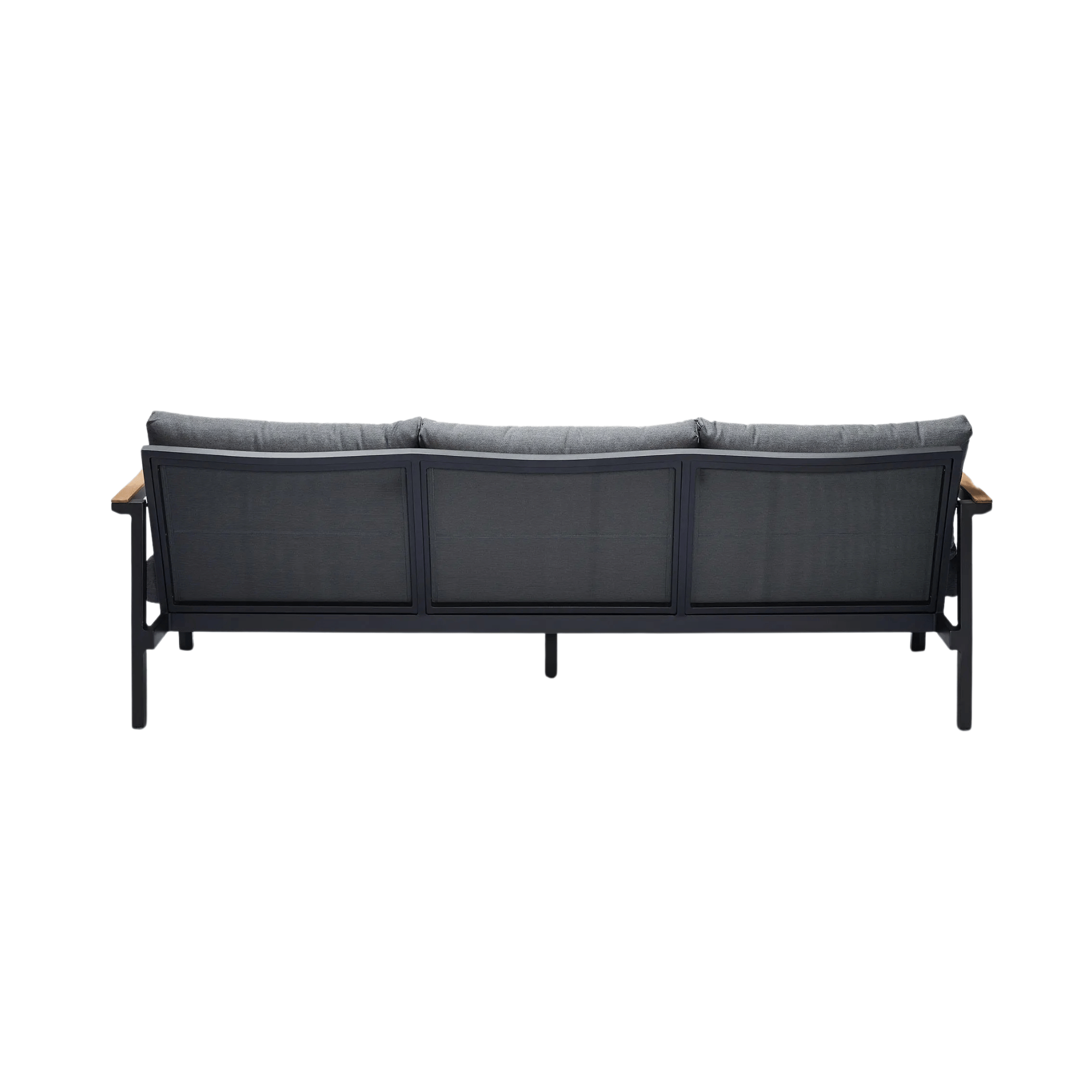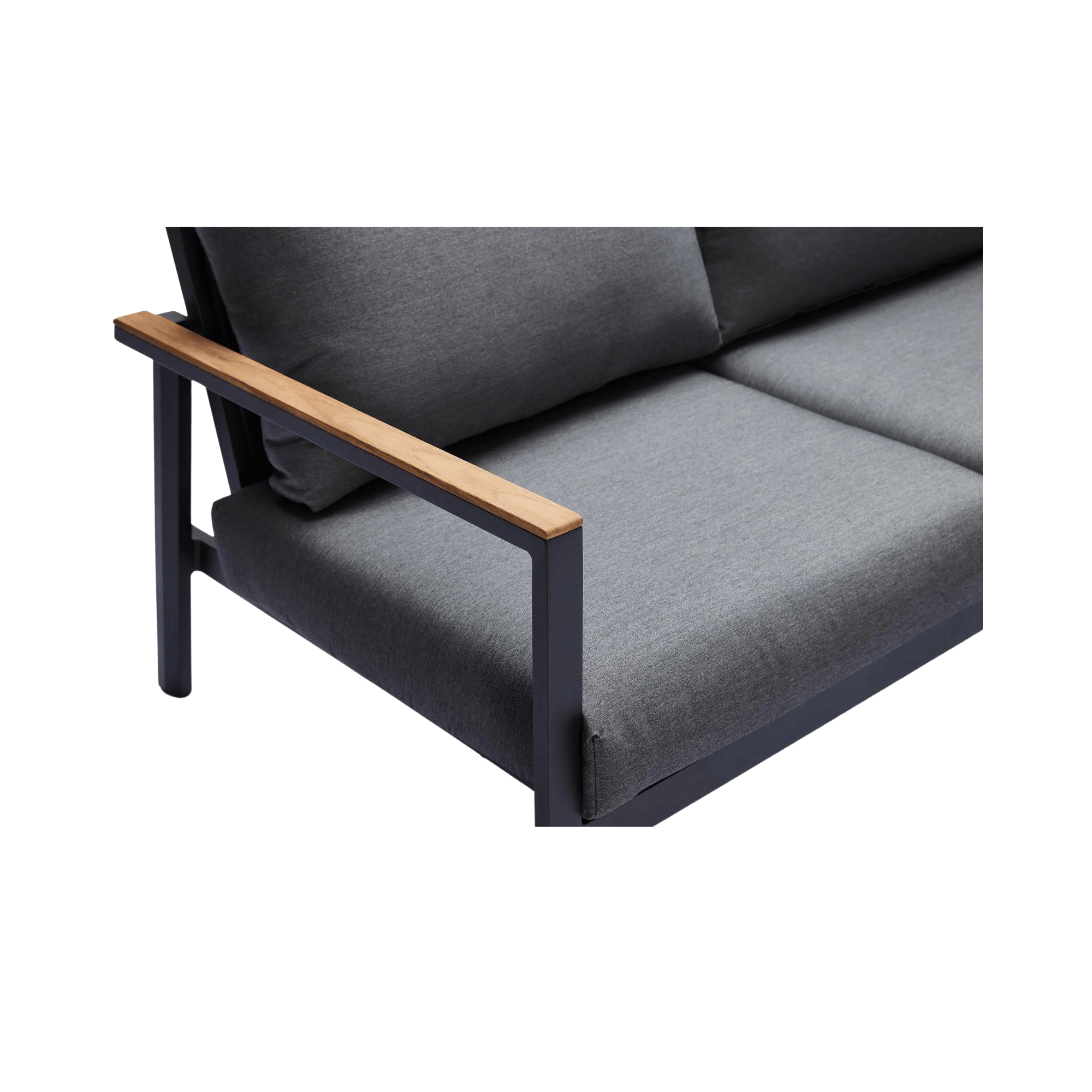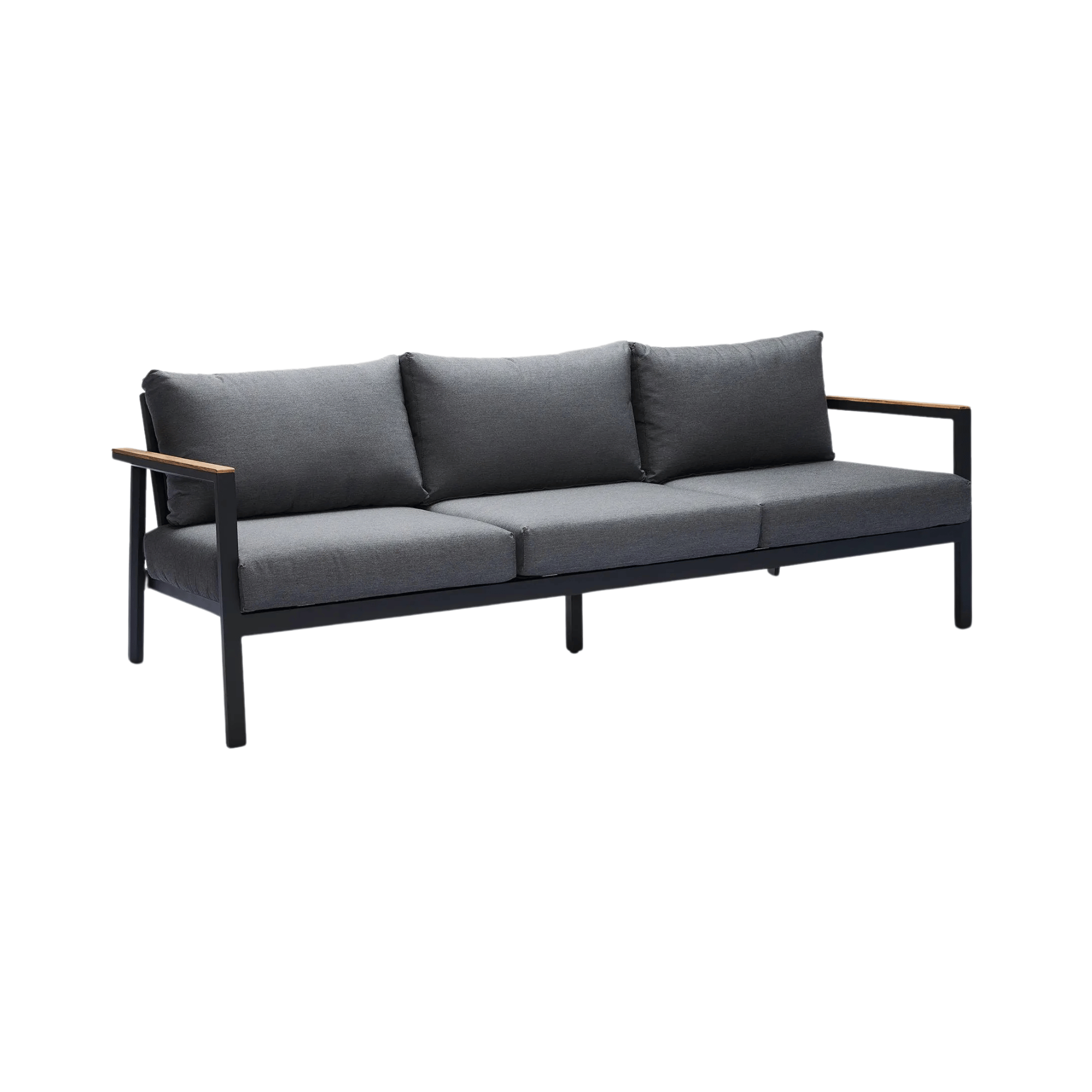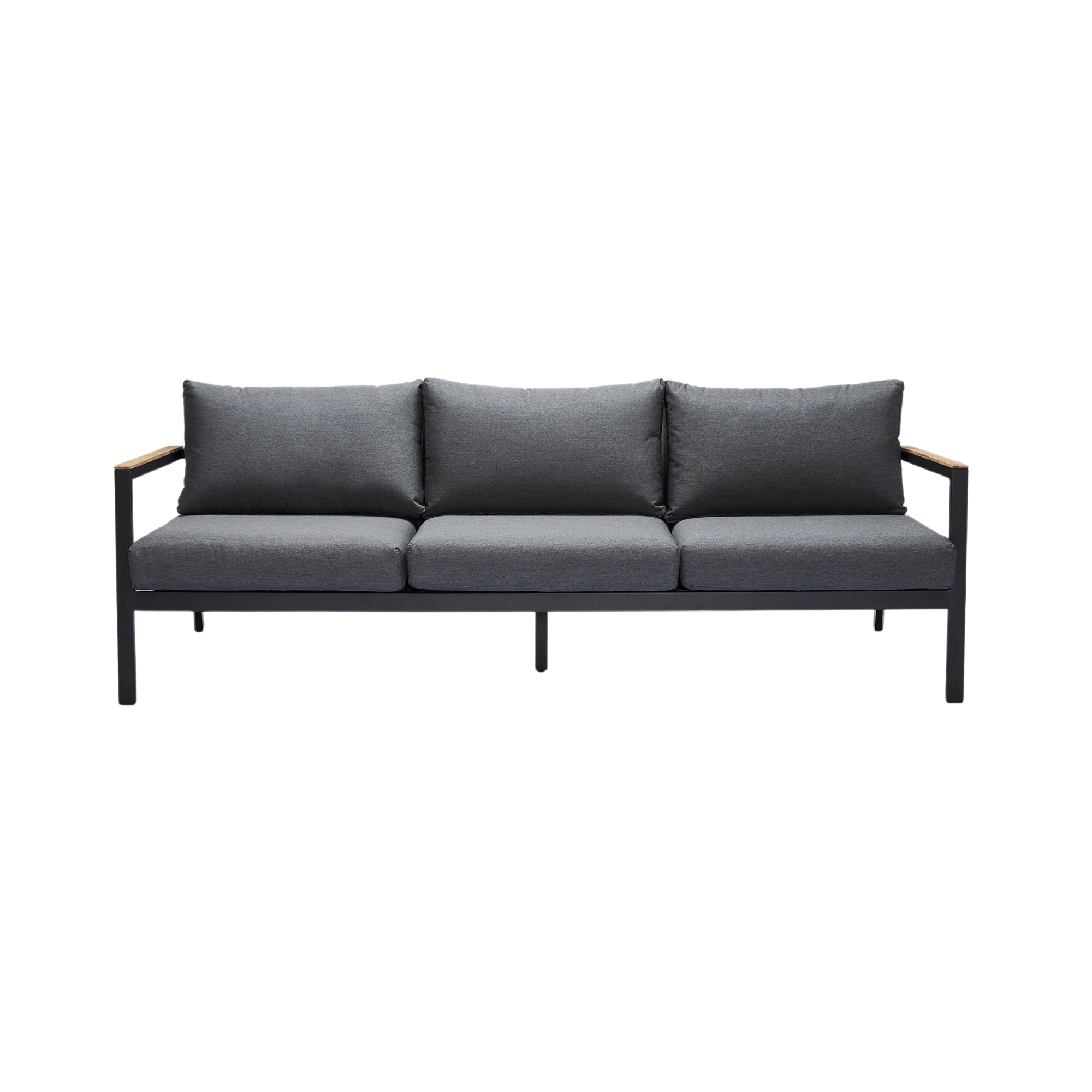 Our Copenhagen 3-Seater Outdoor Sofa in Charcoal combines classic styling with a contemporary appeal. This modern slimline sofa is designed for comfort & practicality. Also available to purchase in 1 and 2-seaters. The Copenhagen Lounge is a top-quality outdoor sofa featuring a charcoal powder-coated aluminum frame and teak armrest detail, with outdoor-specific fabric seat & back cushions.