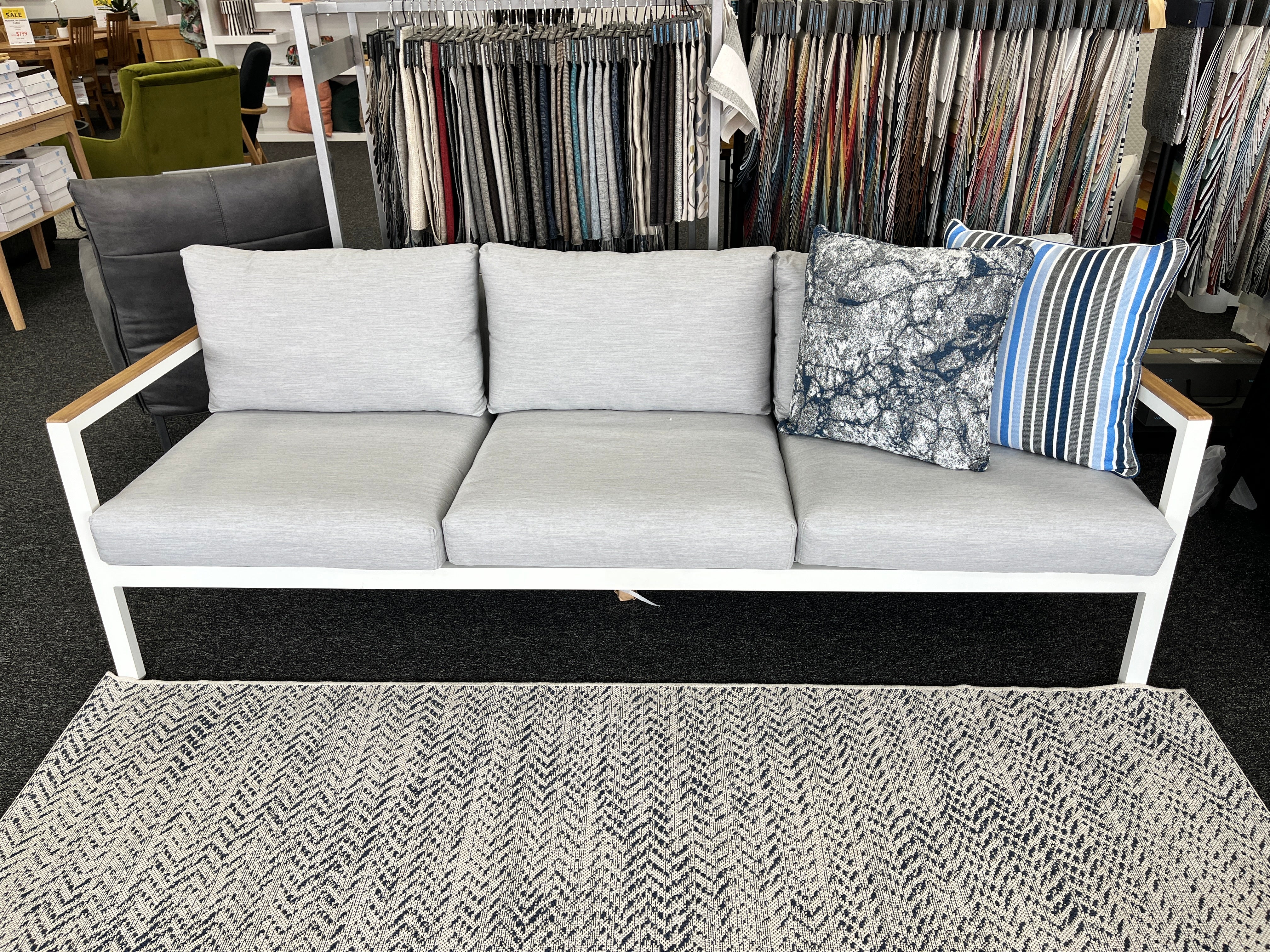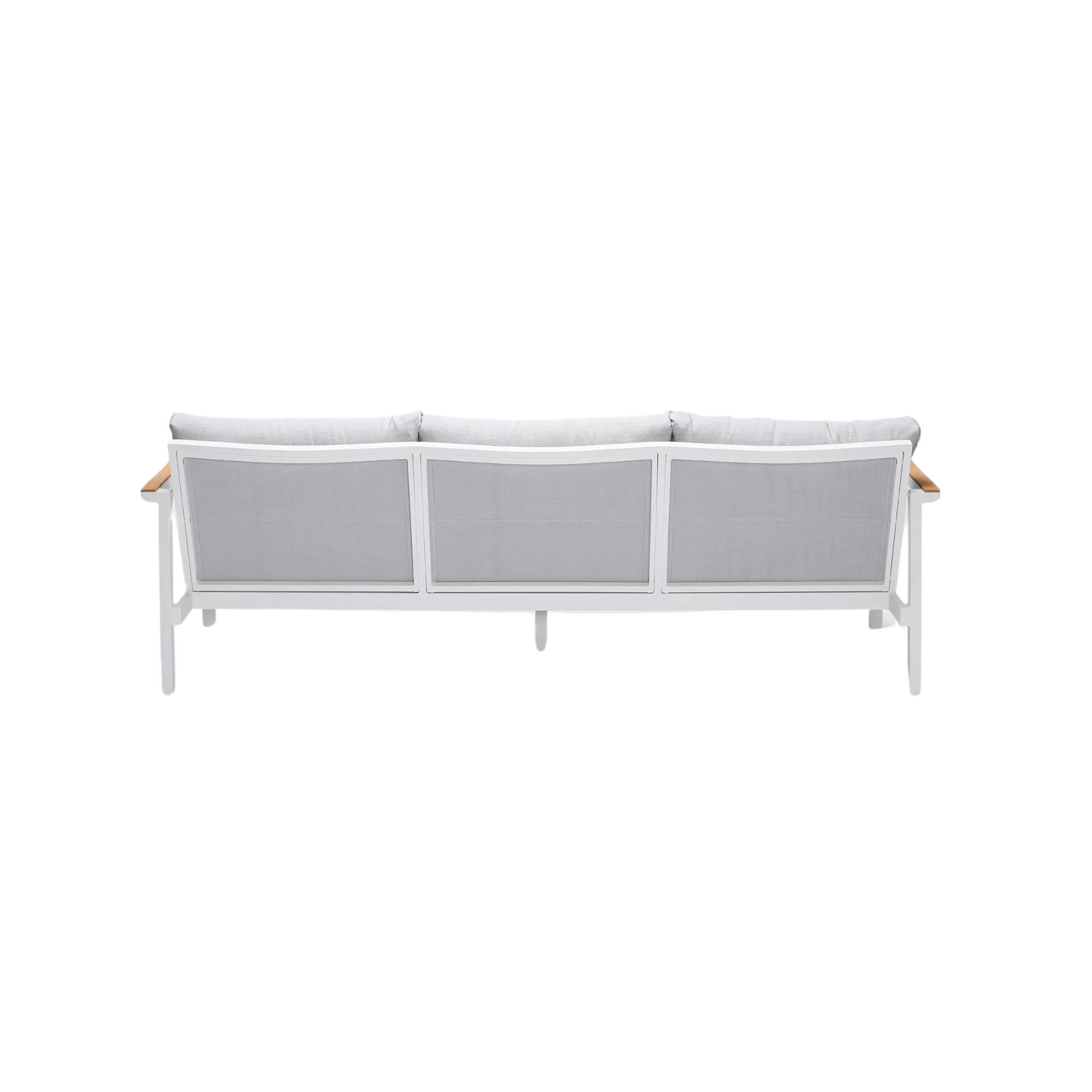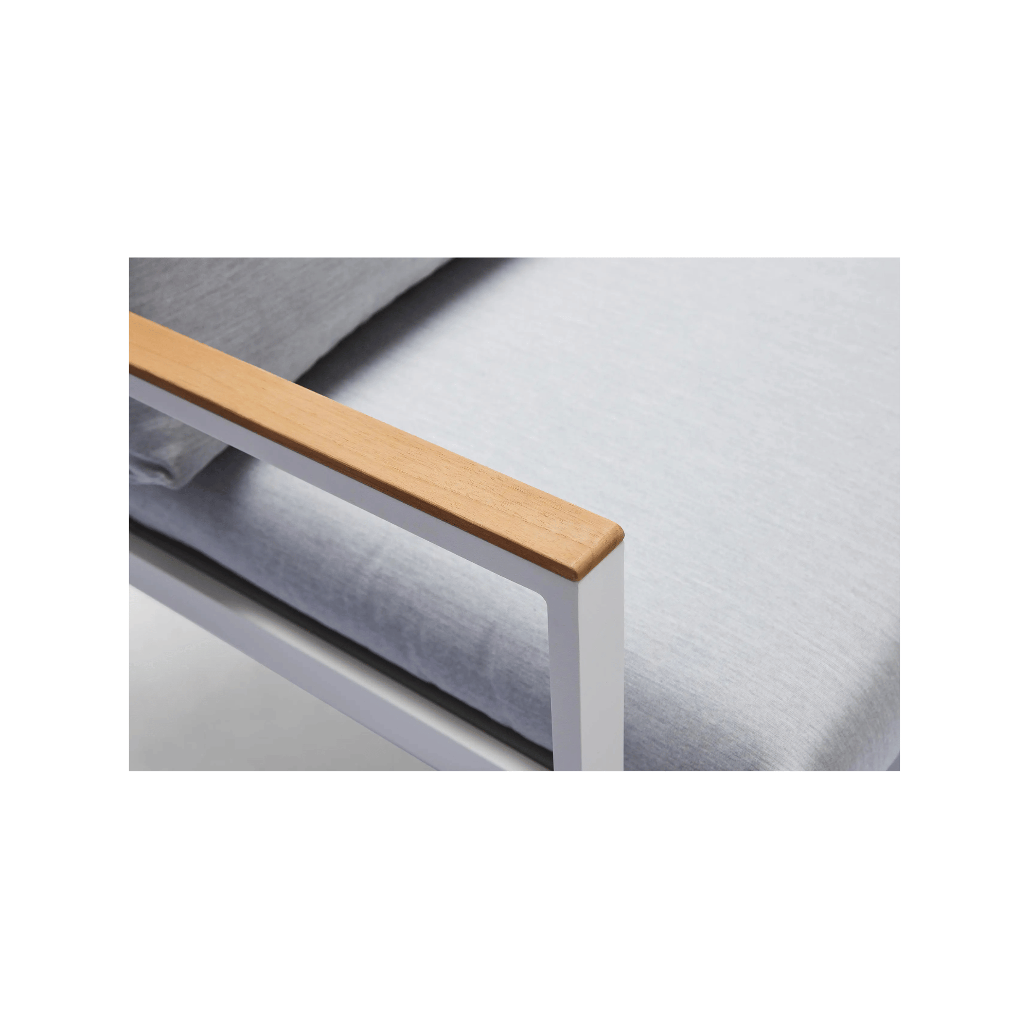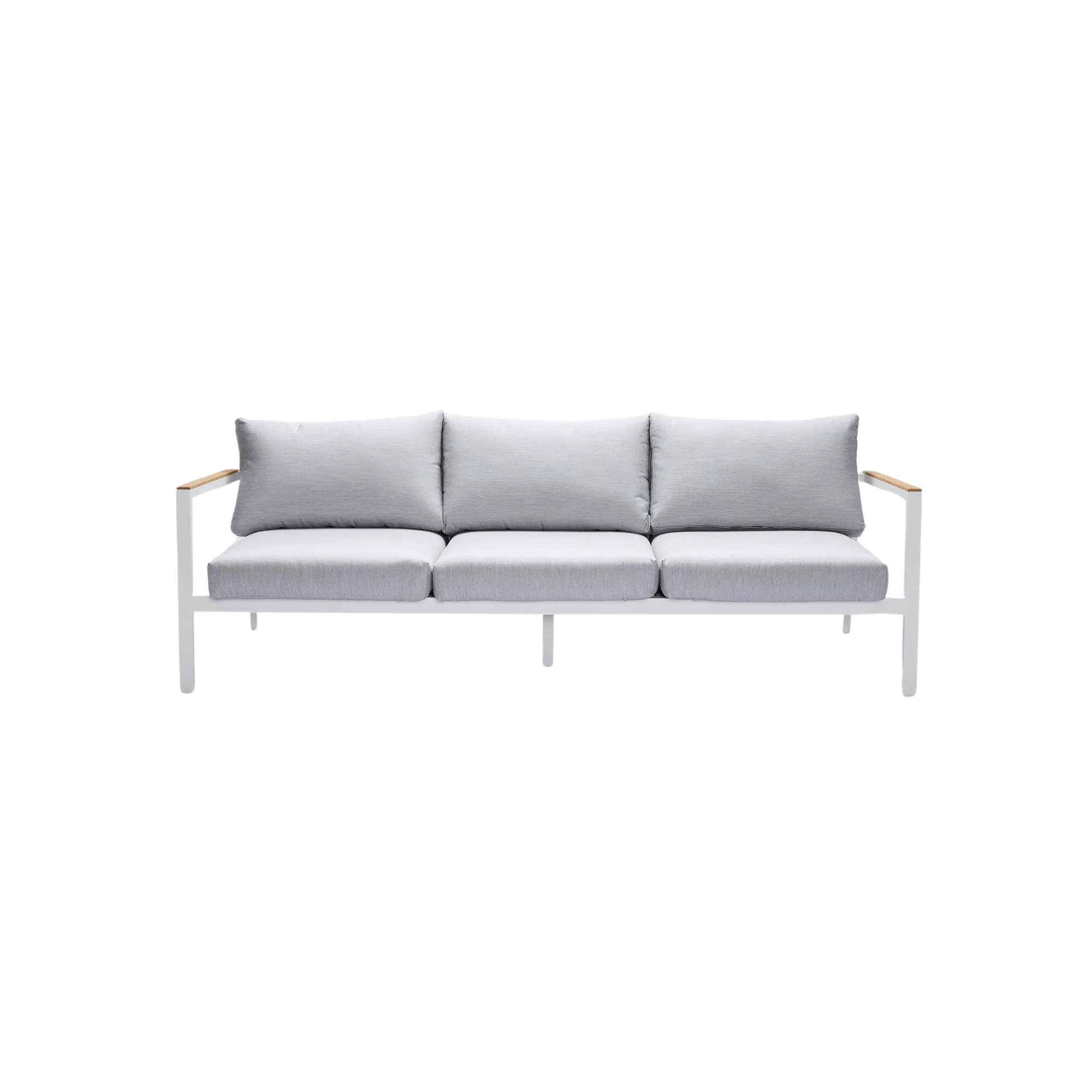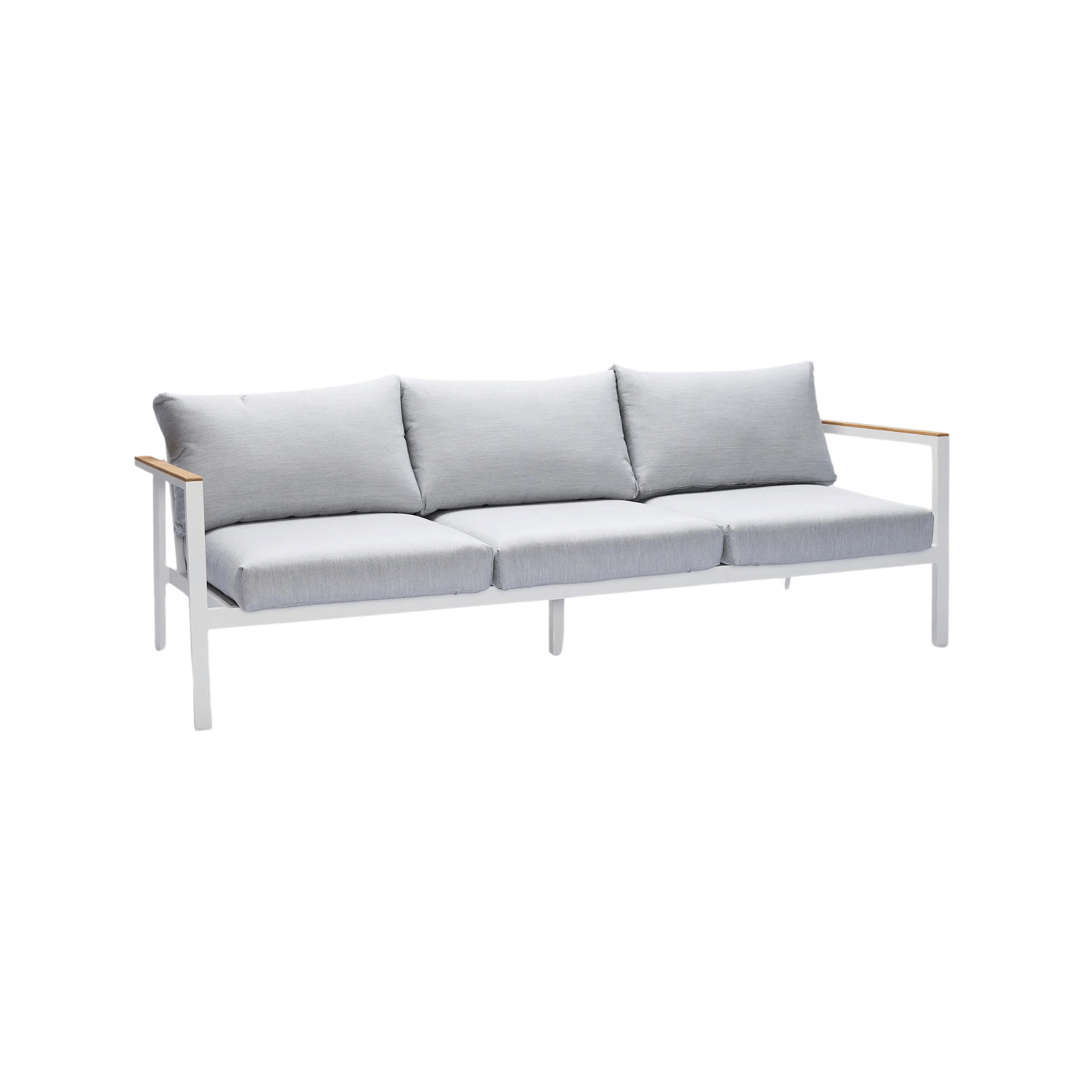 Our Copenhagen 3-seater Outdoor Sofa in White combines classic styling with a contemporary appeal. This modern slimline sofa is designed for comfort & practicality. Also available to purchase in 1 and 2-seaters. The Copenhagen Lounge is a top-quality outdoor sofa featuring a white powder-coated aluminum frame and teak armrest detail, with outdoor-specific fabric seat & back cushions.