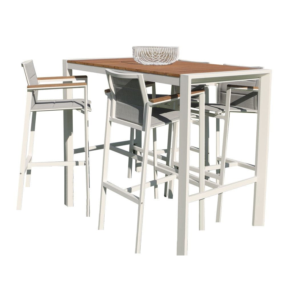 Our 1500x750mm white Copenhagen outdoor bar table features powder-coated aluminum with teak timber. This package includes 4 Copenhagen outdoor bar chairs. The table requires some assembly.