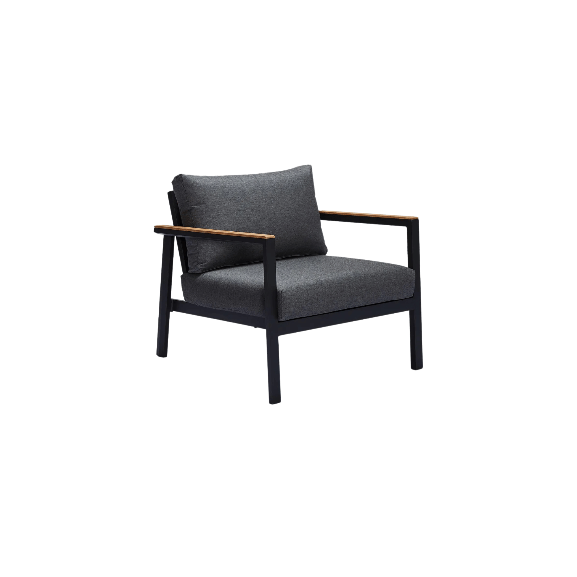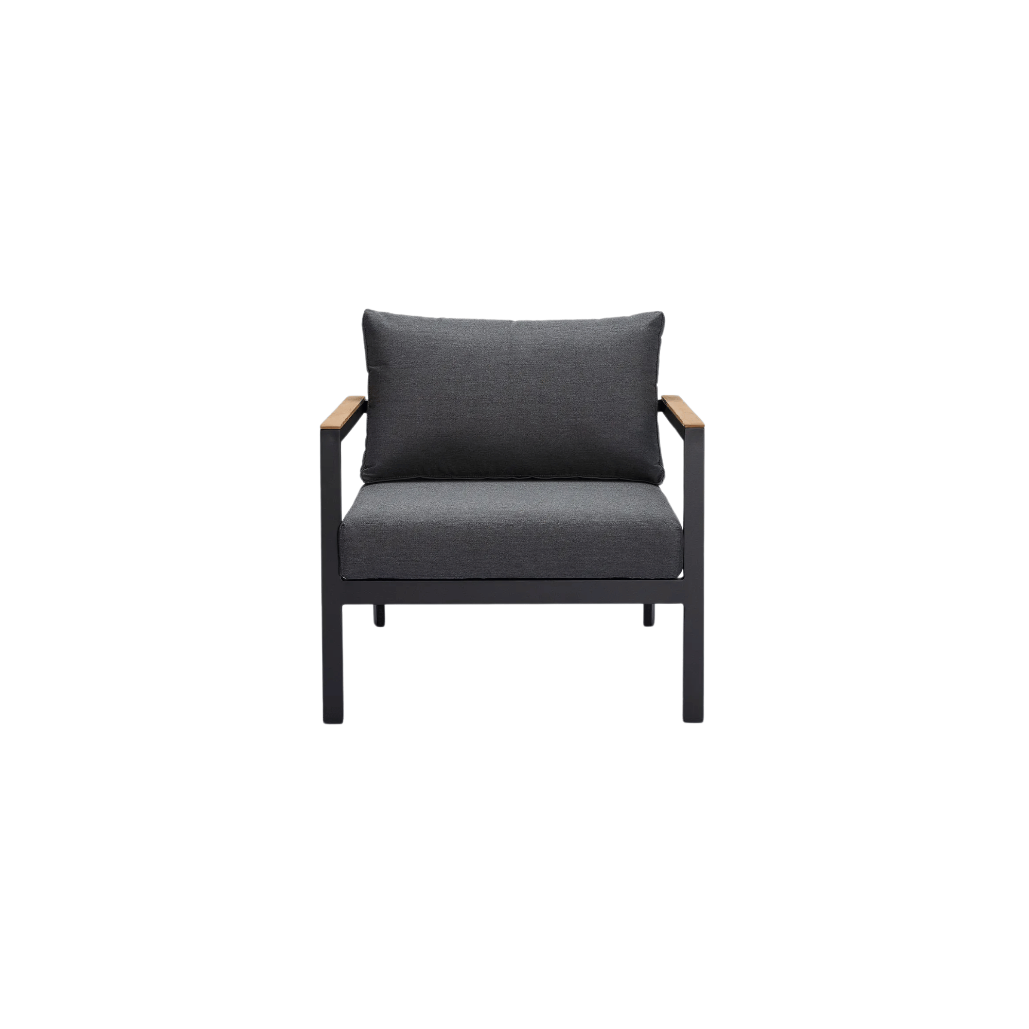 Our Copenhagen Outdoor Lounge Chair in Charcoal combines classic styling with a contemporary appeal. This modern slimline chair is designed for comfort & practicality. Also available to purchase in 2 and 3-seaters. The Copenhagen Lounge is a top-quality outdoor sofa featuring a charcoal powder-coated aluminum frame and teak armrest detail, with outdoor-specific fabric seat & back cushions.