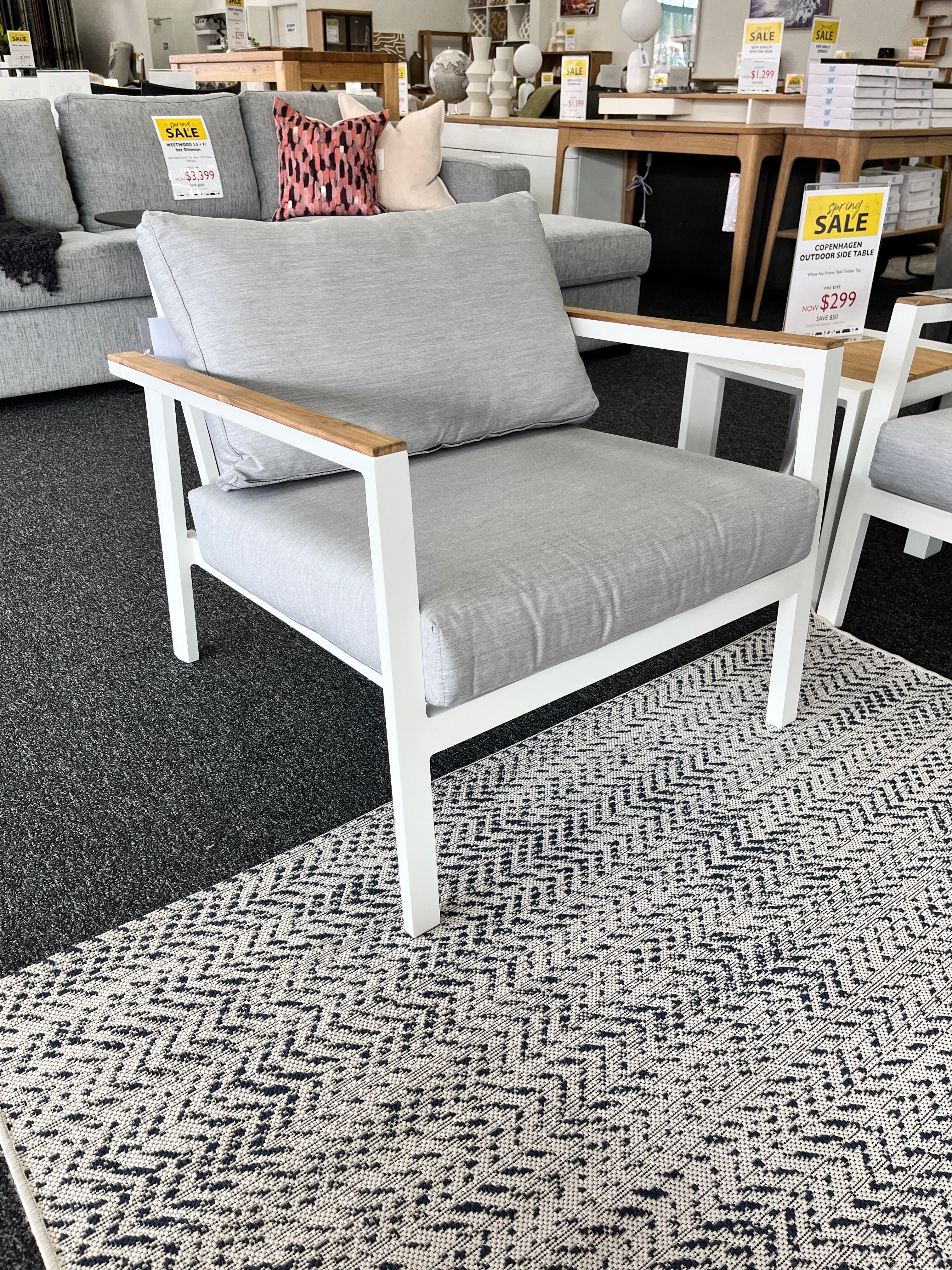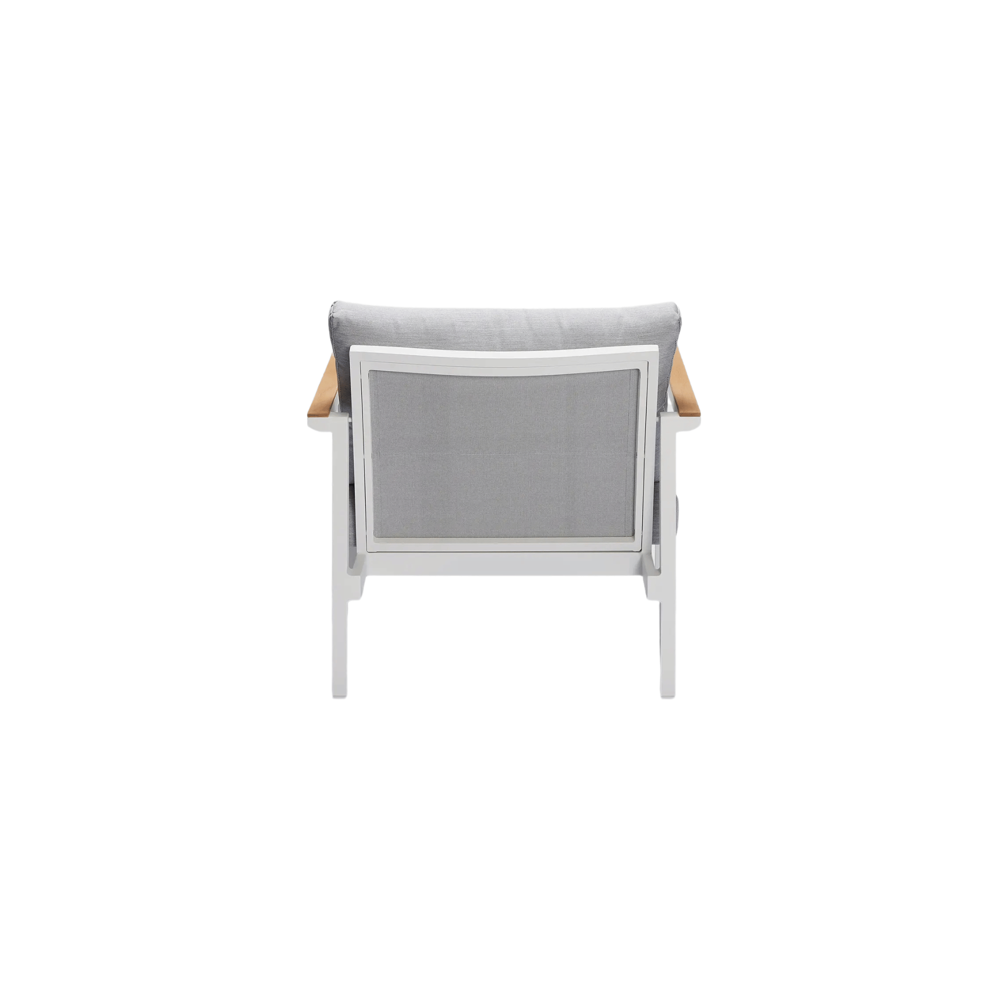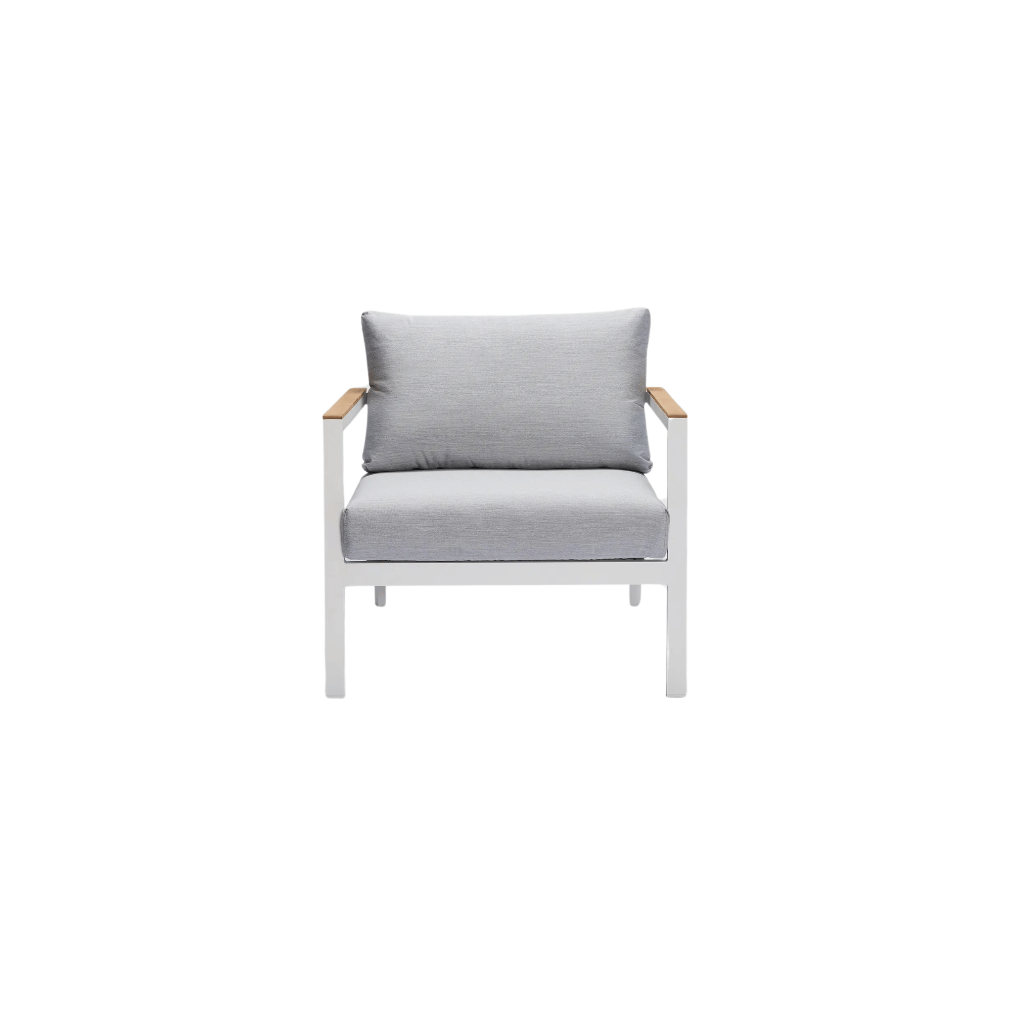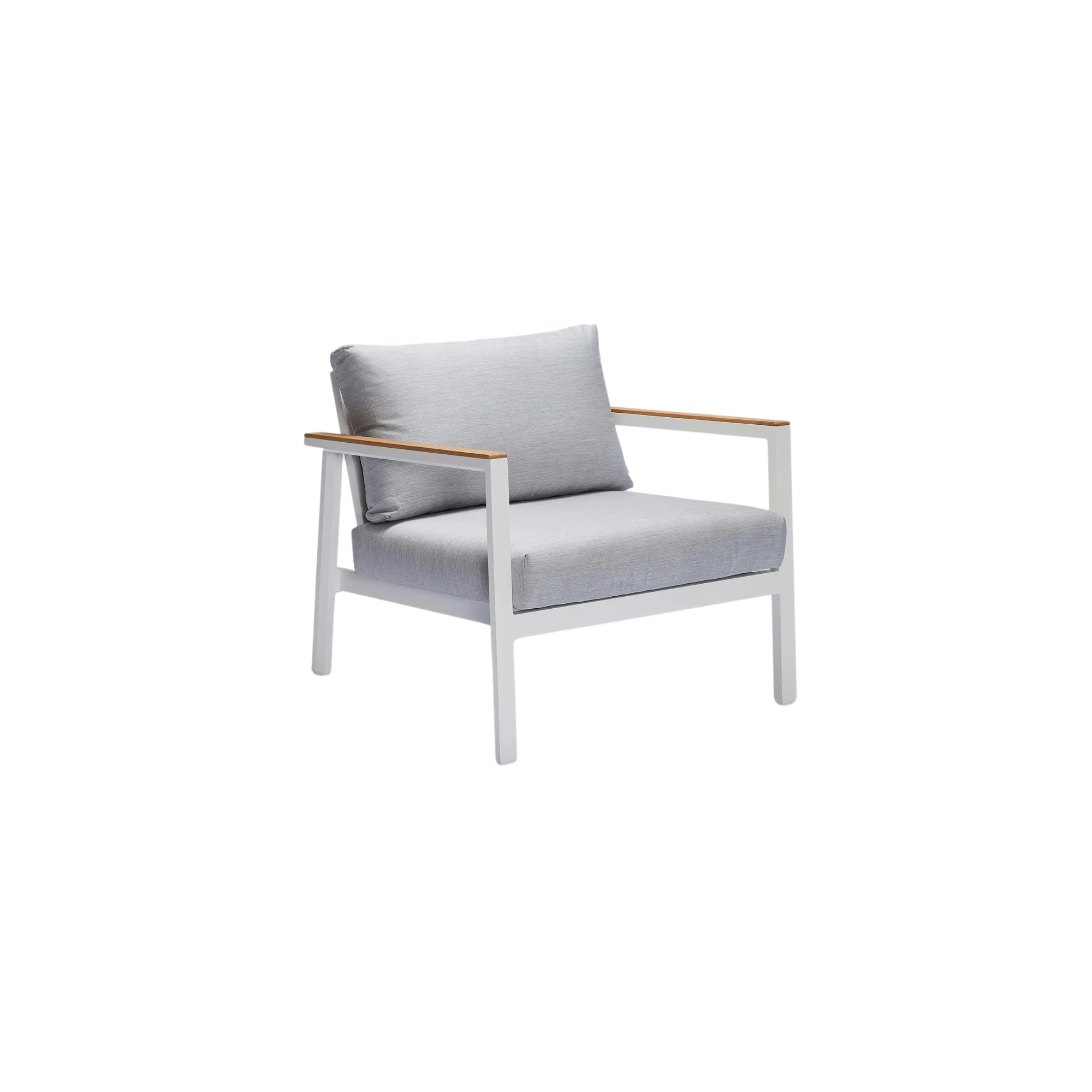 Our Copenhagen Outdoor Lounge Chair in White combines classic styling with a contemporary appeal. This modern slimline chair is designed for comfort & practicality. Also available to purchase in 2 and 3-seaters. The Copenhagen Lounge is a top-quality outdoor sofa featuring a white powder-coated aluminum frame and teak armrest detail, with outdoor-specific fabric seat & back cushions.