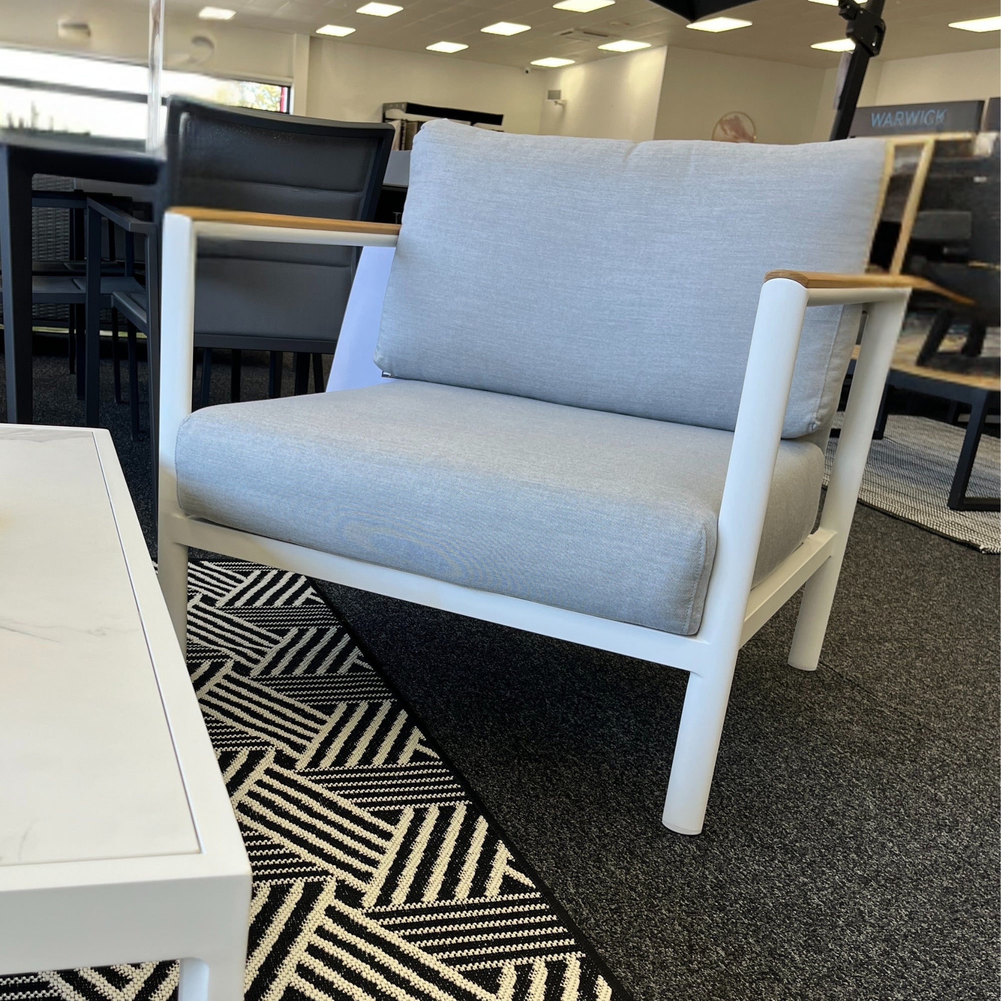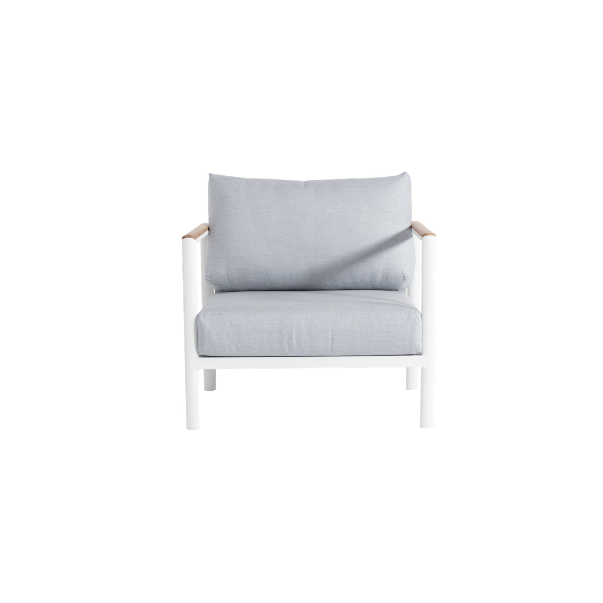 Our Grenada Outdoor Lounge Chair in White combines classic styling with a contemporary appeal. This modern slimline chair is designed for comfort & practicality. Also available to purchase in 2 and 3-seaters. The Grenada Lounge is a top-quality outdoor sofa featuring a white powder-coated aluminum frame and teak armrest detail, with outdoor-specific fabric seat & back cushions.
