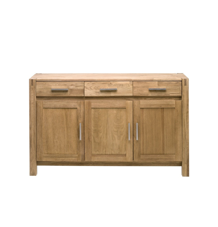 The Modena Sideboard featuring 3 doors and 3 shelves is expertly crafted from natural oiled oak / oak veneer timber. With a minimalist yet distinctive design, it will complement a range of different styles of interior decor. The Modena is a functional sideboard suitable for any decor style.