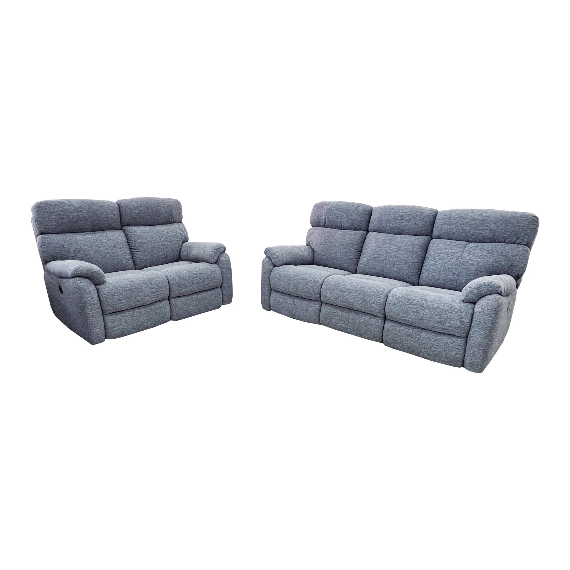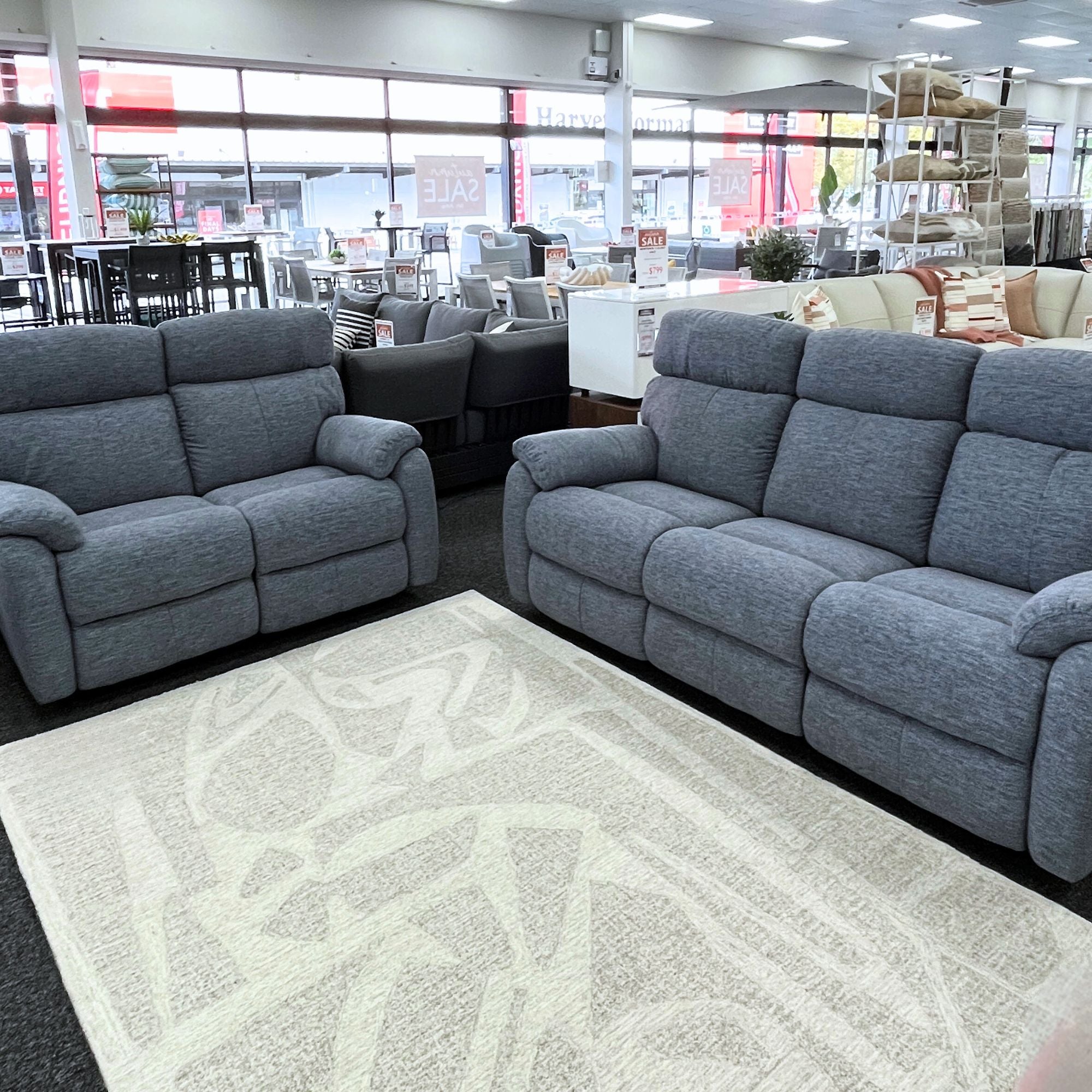 The Cortez lounge suite in Urban Sofa Thunderstorm fabric includes a 3-seater & 2-seater sofa with electric recliners.