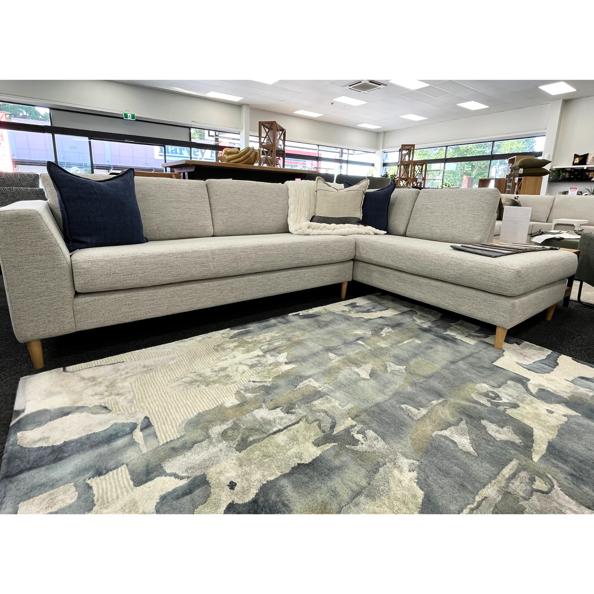 The Picasso corner sofa in Maverick Pumice fabric will suit any modern home. This sofa chaise is made in New Zealand and available to order - choose from a wide selection of fabrics in store.