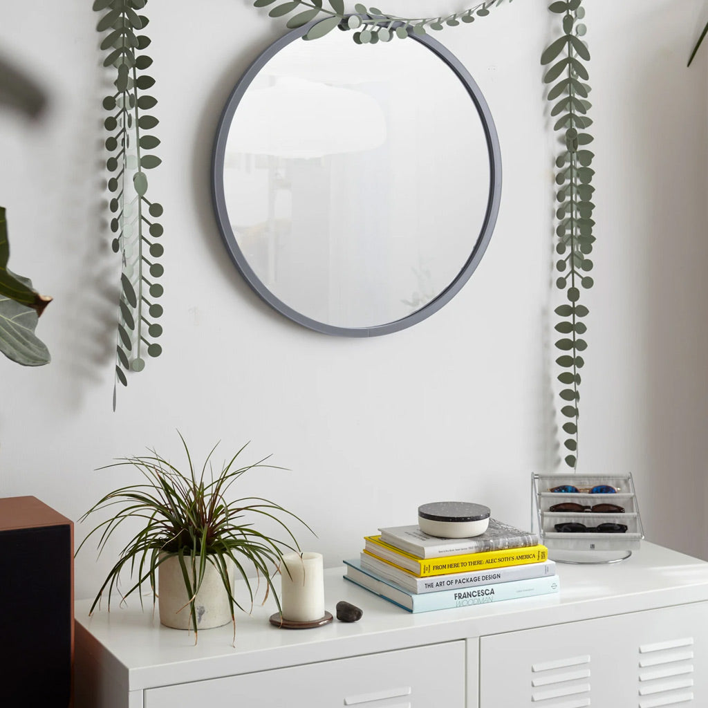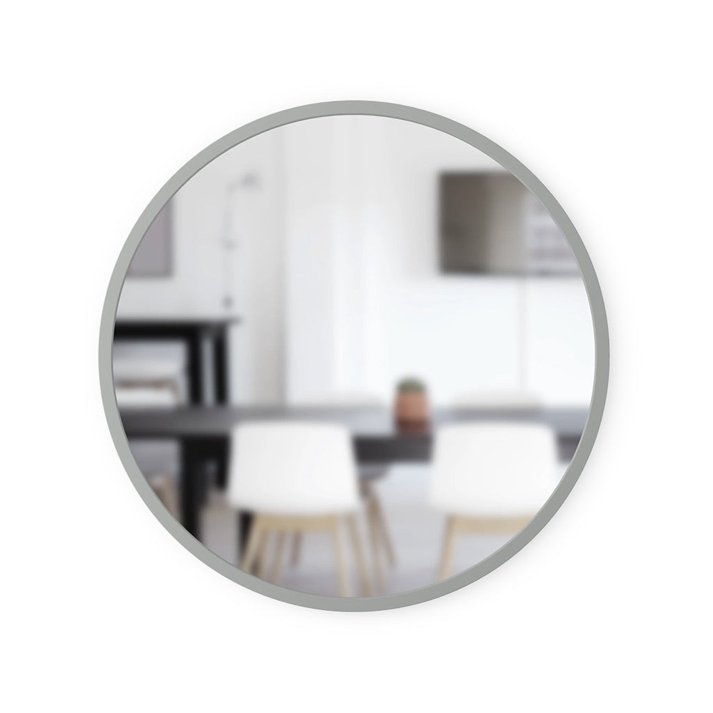 The Hub Wall MirrorIs a large, circular mirror, great for heavily trafficked areas like entryways, bathrooms, living rooms, and hallways. Its rubber rim makes it more durable than your average round wall mirror, and gives it a modern, industrialised look. Introducing this piece to a room adds a subtle layer of dynamic and unexpected texture, thanks to its rubber rim. This wall decor is a simple way to make a significant impact, and because the Hub Wall Mirror is a larger, reflective piece, it will make light bounce around, helping the room appear bigger and brighter. The Hub Wall Mirror's friendly, circular shape looks at home amongst a variety of decors – lending to its ability to evolve with your own changing tastes, and personal style. Dimensions: 94cm diameter.