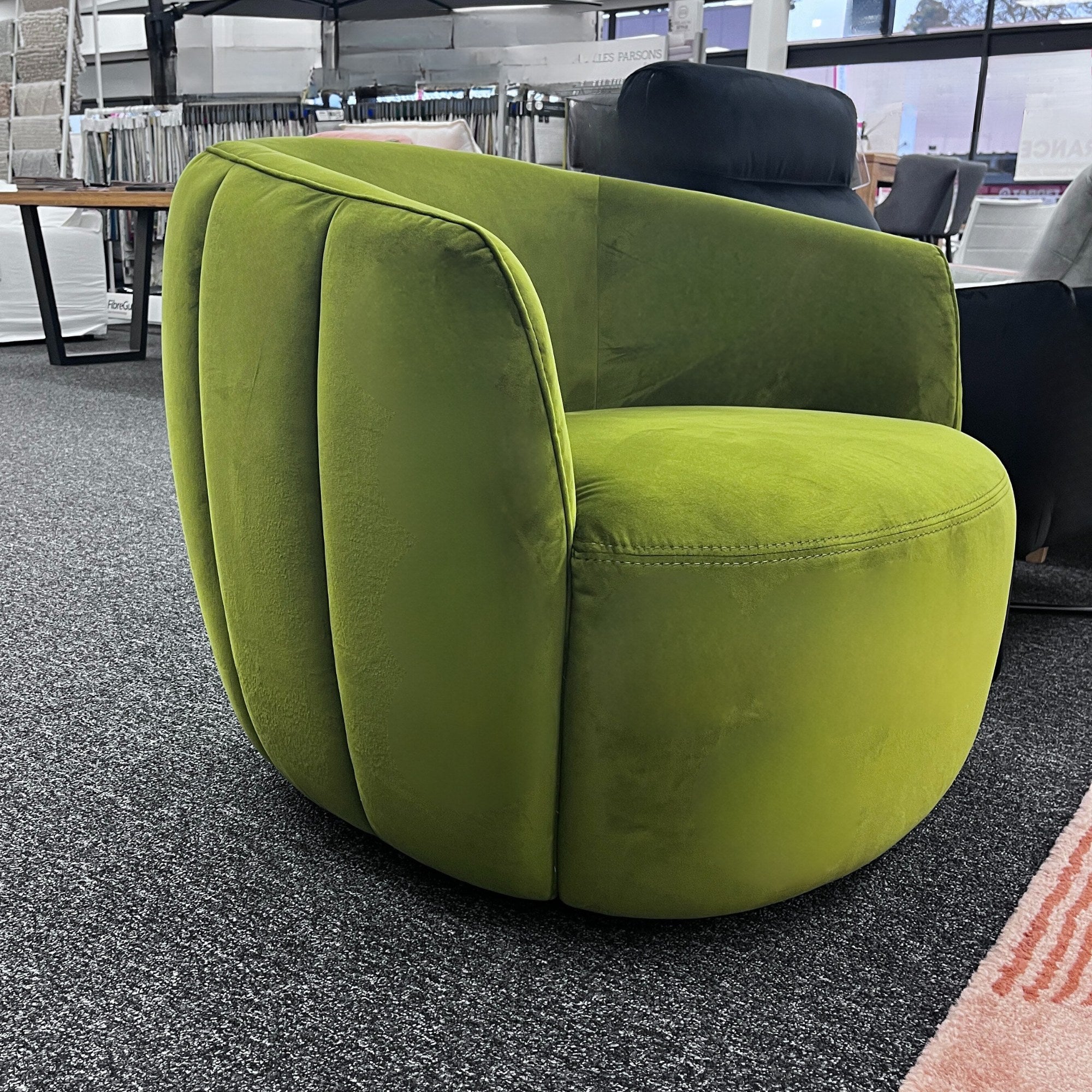 The Petal tub chair in Apple Green Velvet is part of our Urban Sofa range. The Petal armchair features a quilted stitch and swivel base with an auto-return function.