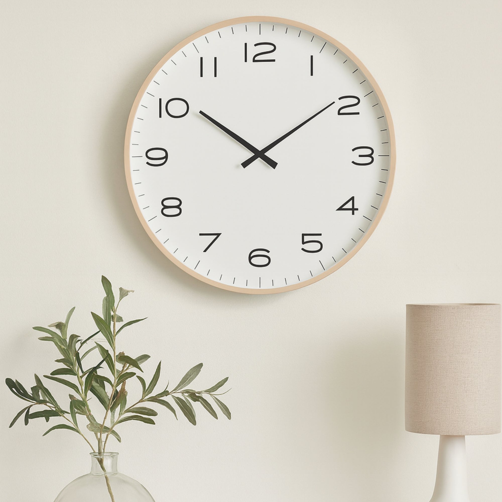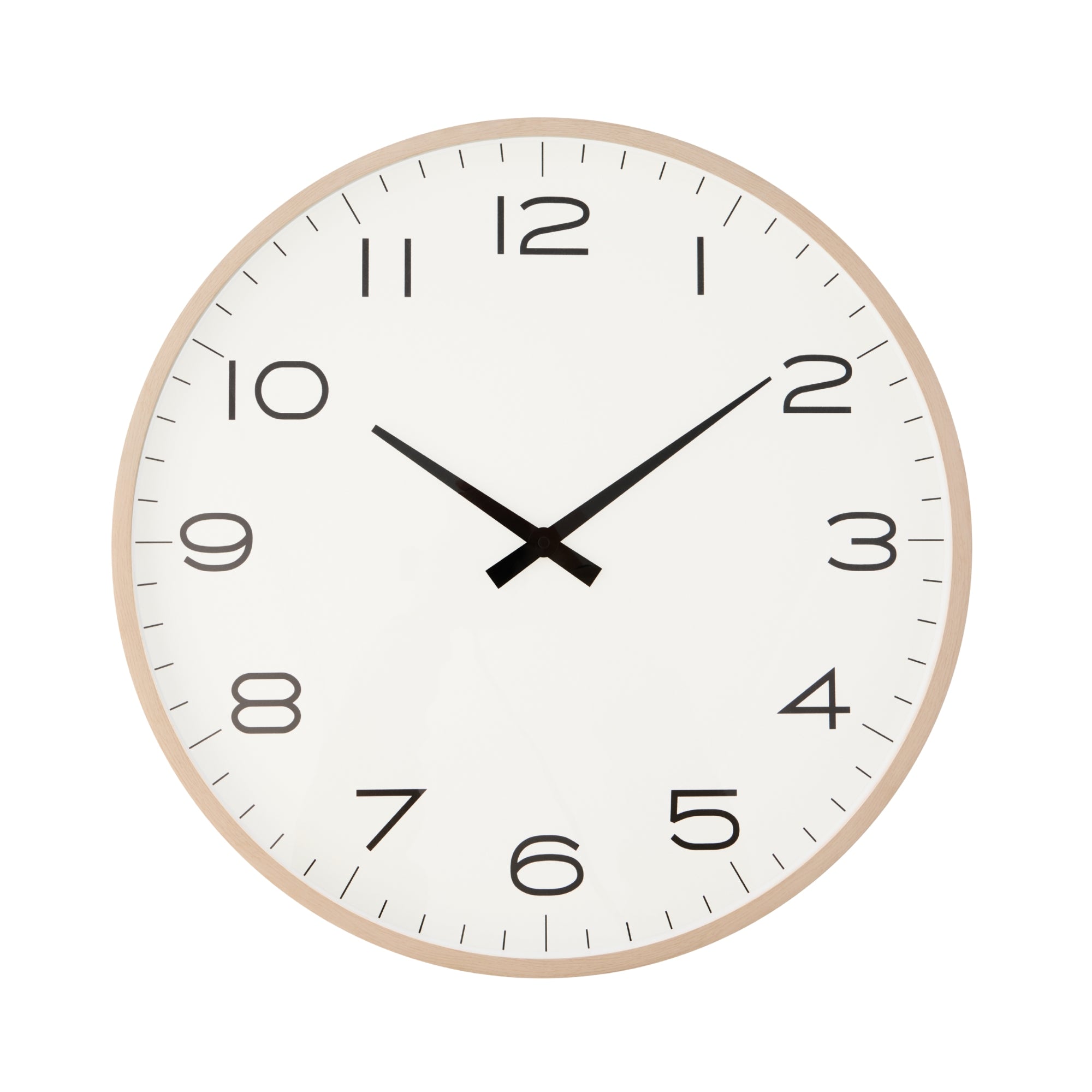 It features a white wash wooden look frame and white dial with large numbers in a round silhouette. The contemporary design perfectly complements all kinds of interiors.