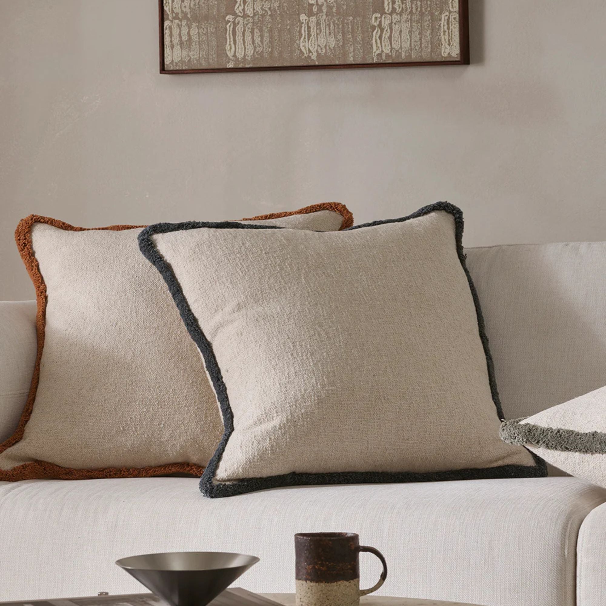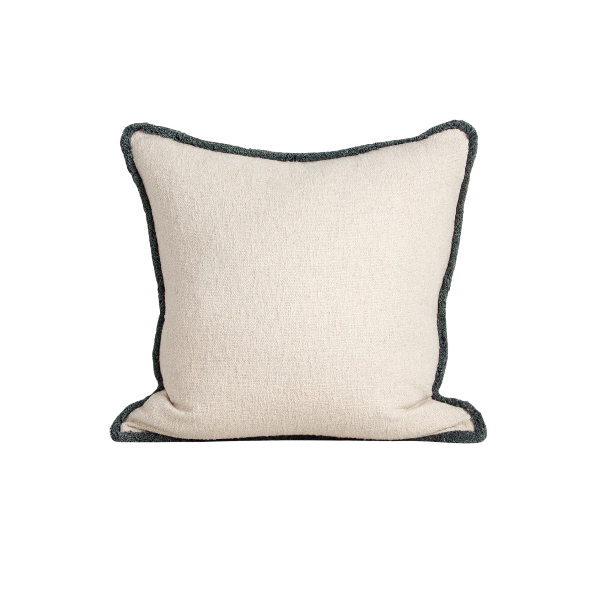 Featuring a soft, off-white bouclé base framed by a chunky cotton fringe, the Darcy cushion’s generous size and inviting texture is designed effortless layering. Made from a blend of cotton and recycled polyester, the slate-blue fringe adds a subtle element of colour that adds depth and contrast to cushion pairings.