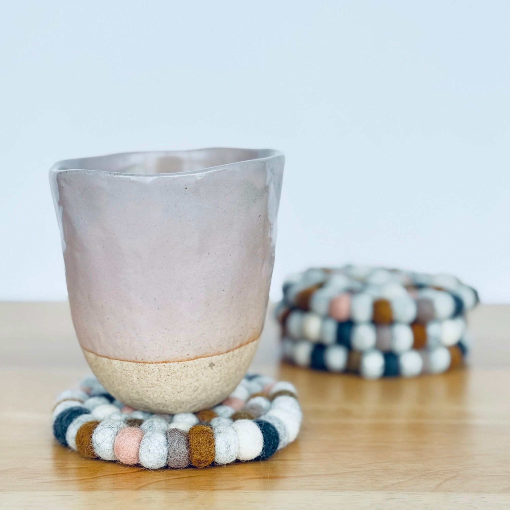 Handcrafted felt ball coasters in earthy multi colours – soft, durable, and the perfect pop of colour for your table.