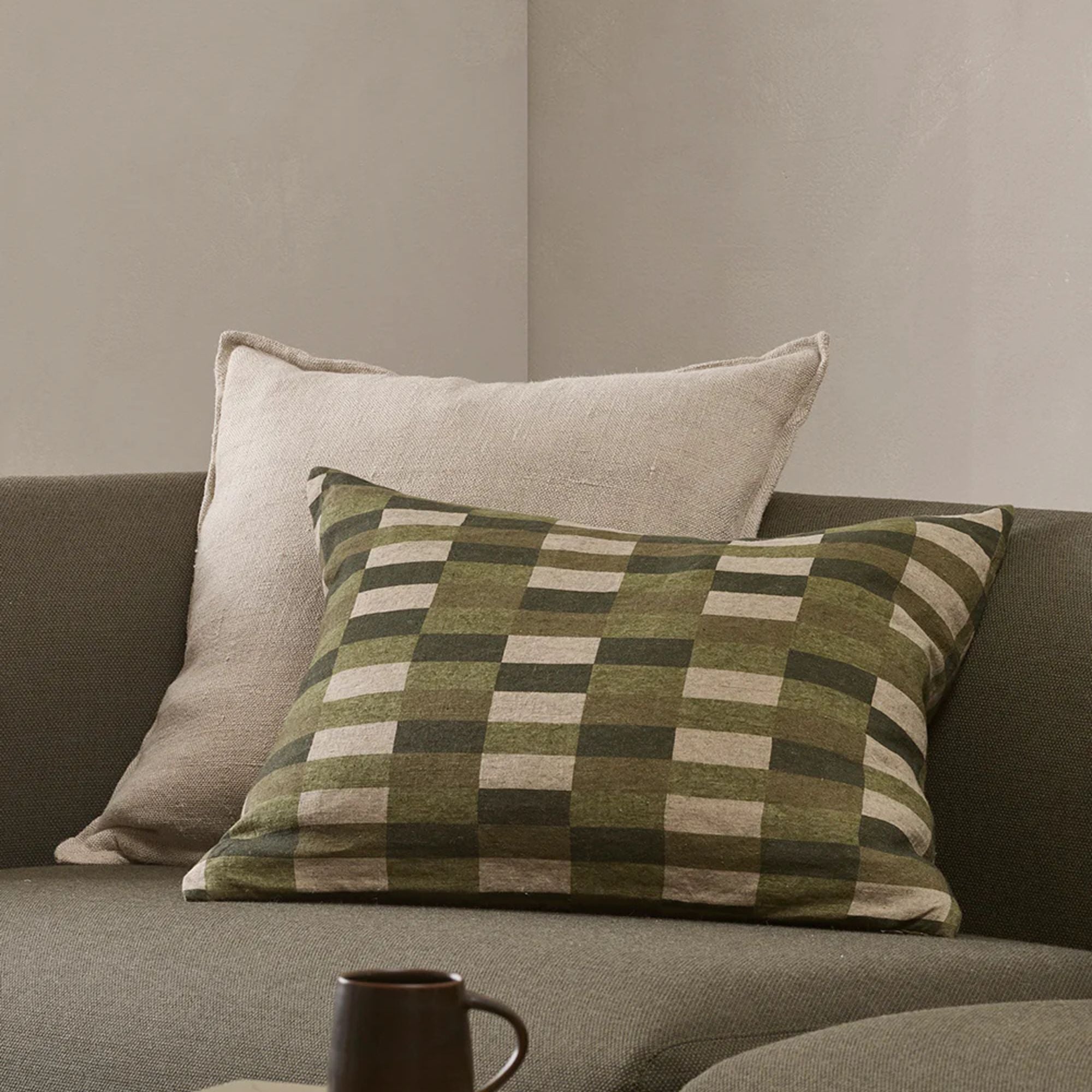 Nature meets geometry in the grid-patterned design of the Hugo lumbar cushion. Printed on a pure linen base, the moss-green palette echoes the varied shades of forest undergrowth, bringing a grounded, graphic element to layered interiors.