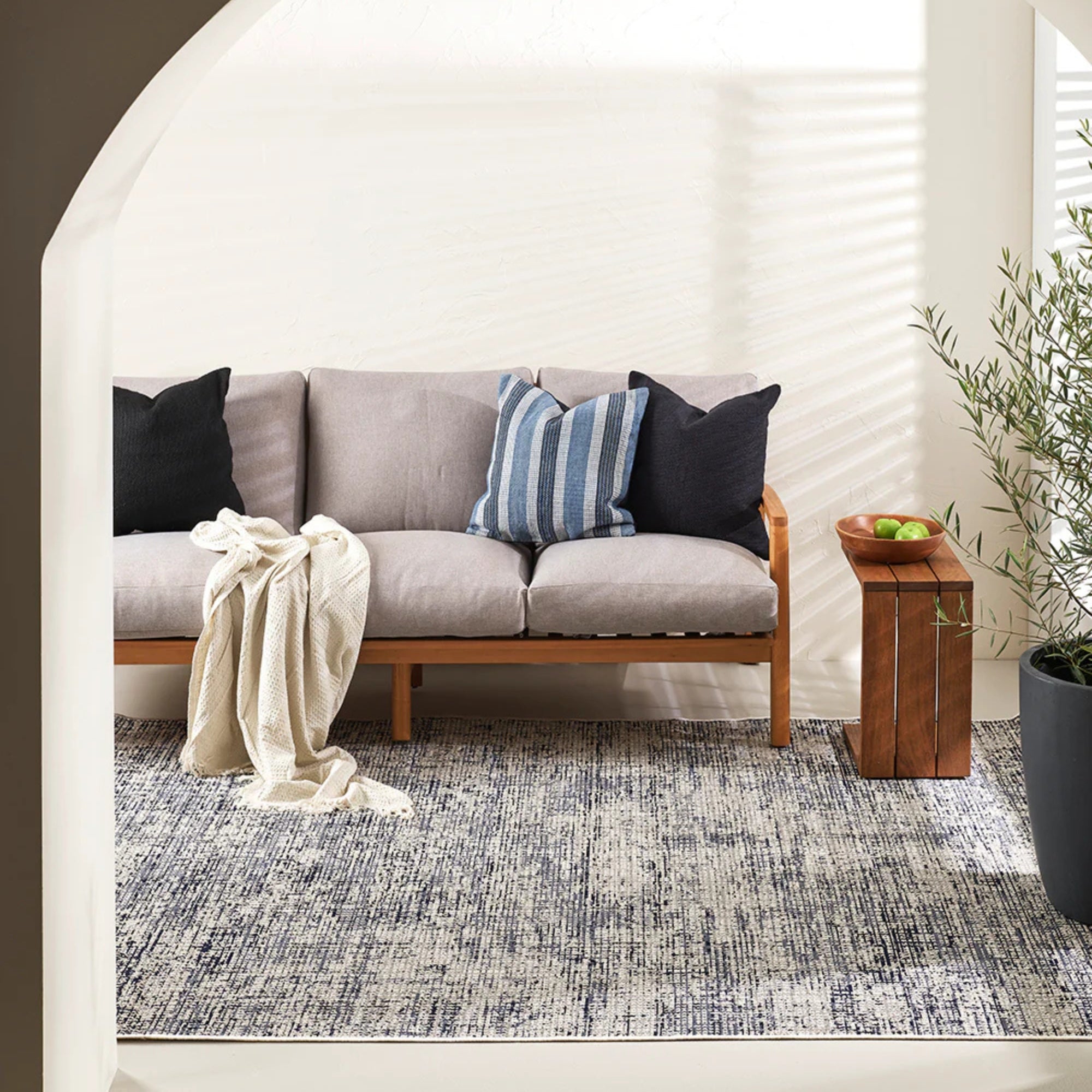 The subtle texture and fresh navy/white colour palette makes this rug an easy and durable piece that is suitable for either indoor or outdoor use.