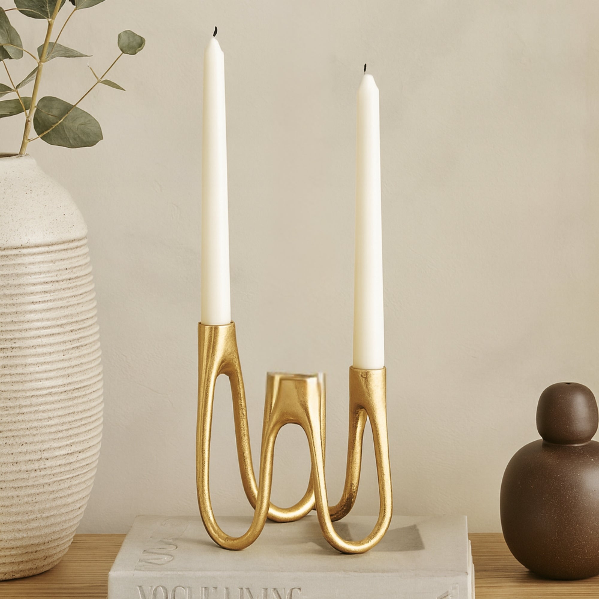 This candle holder is crafted from aluminium with nickel plating in a gold finish. Its elegant silhouette holds three taper candles, making it a striking piece that complements both classic and contemporary interiors.