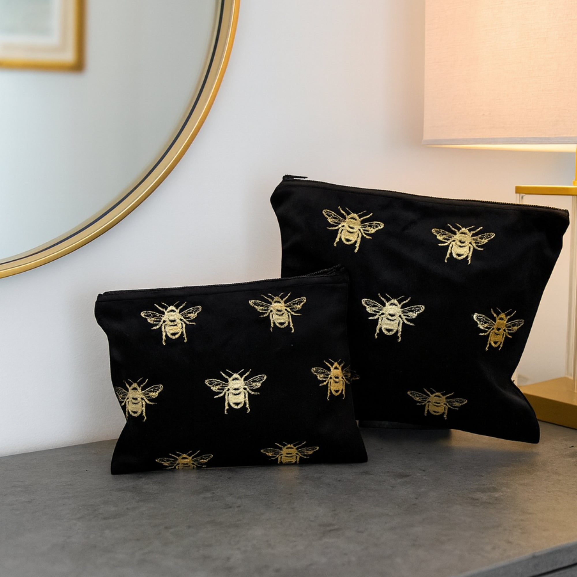Chic and functional, the Velvet Bee Toilet Bag Set of 2 is crafted in black velvet with gold foil accents. With two versatile sizes, these bags are perfect for storing makeup, toiletries, or travel essentials in style.