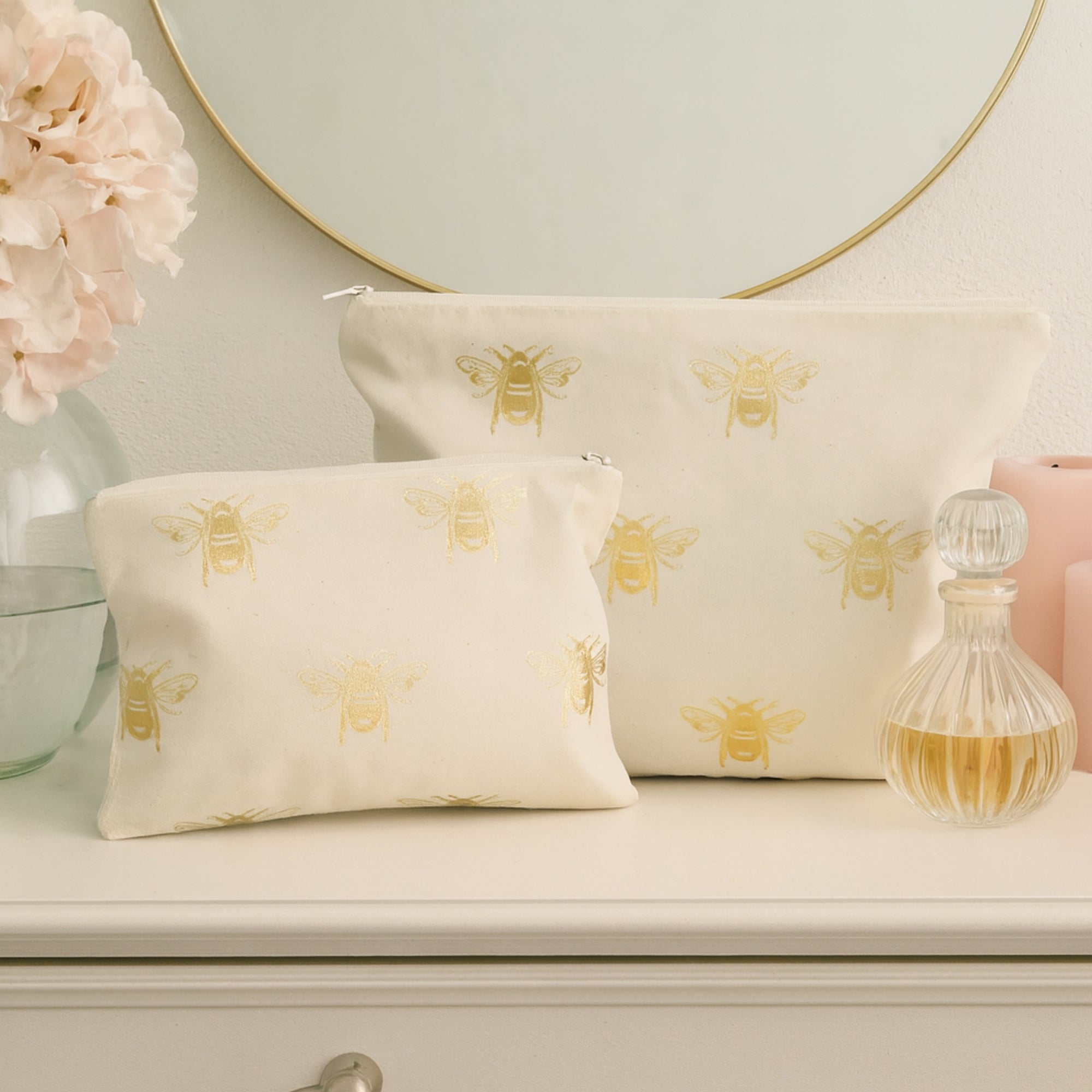 Chic and functional, the Velvet Bee Toilet Bag Set of 2 is crafted in soft pearl velvet with gold foil accents. With two versatile sizes, these bags are perfect for storing makeup, toiletries, or travel essentials in style.
