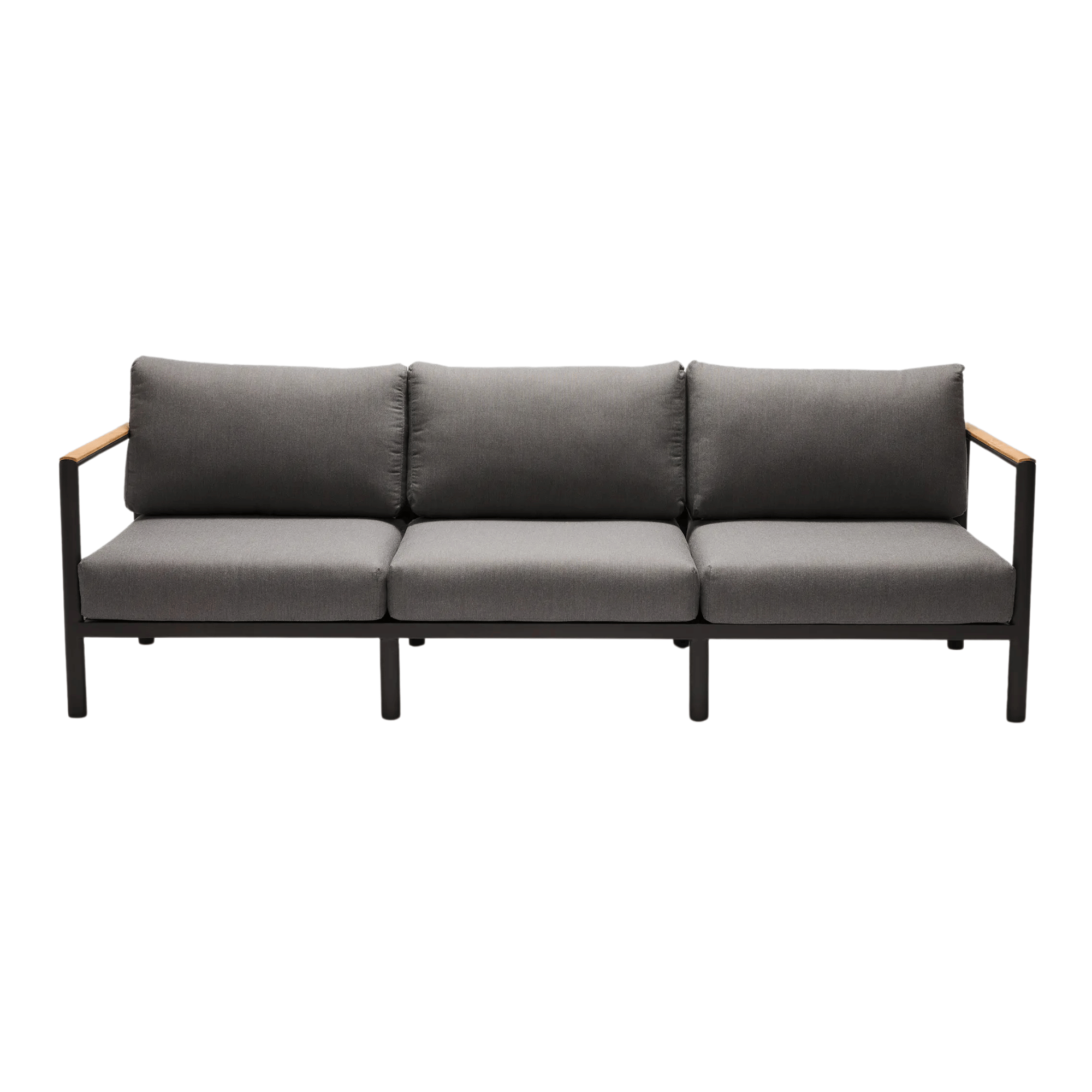 Our Grenada 3-Seater Outdoor Sofa in Charcoal combines classic styling with a contemporary appeal. This sofa is designed for comfort & practicality. Also available to purchase in 1 and 3-seaters. The Grenada Lounge is a top-quality outdoor sofa featuring a charcoal powder-coated aluminum frame and teak armrest detail, with outdoor-specific fabric seat & back cushions.