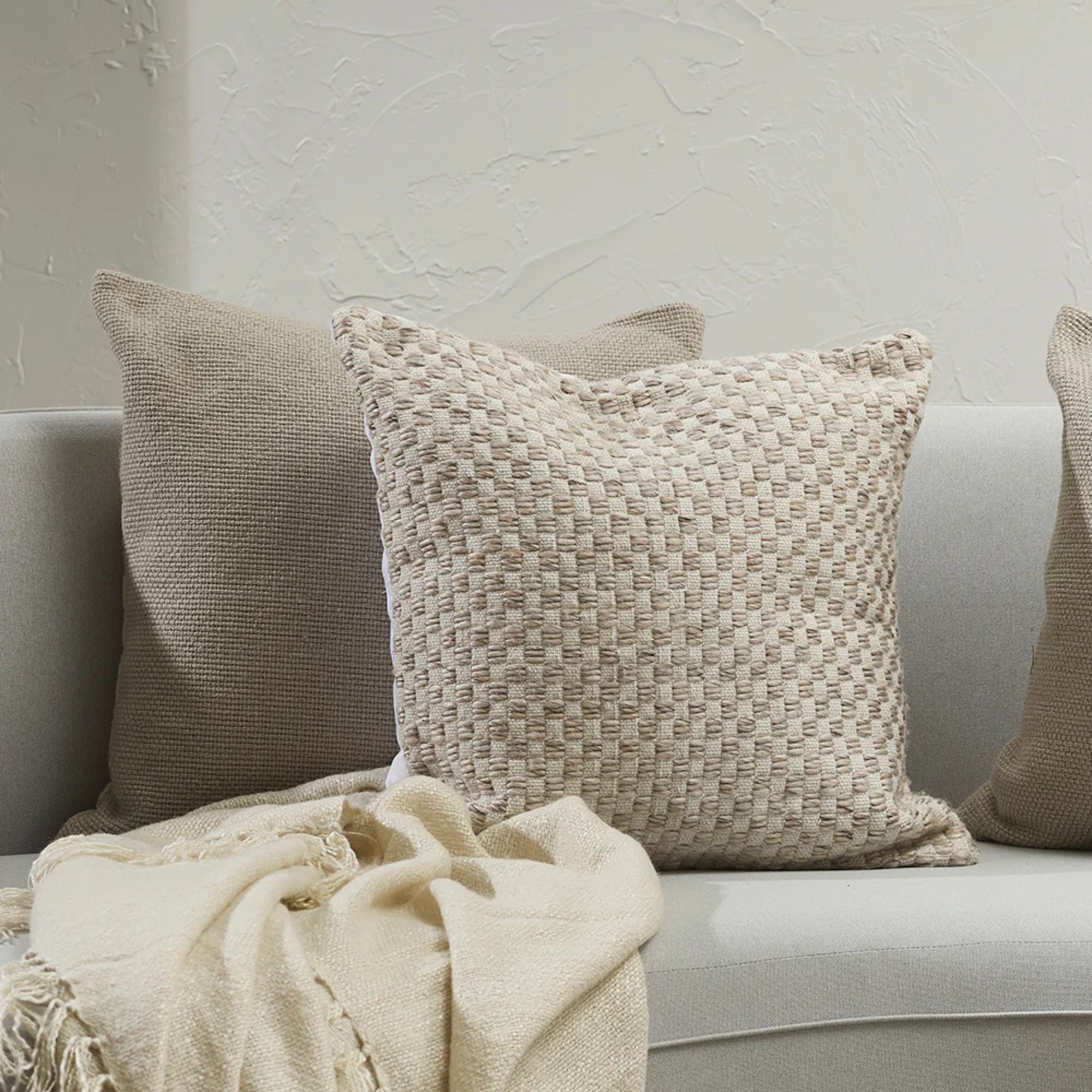 A textural, checkerboard outdoor cushion design in neutral tones, that coordinates beautifully with Southwold Ecru and Easton Black.