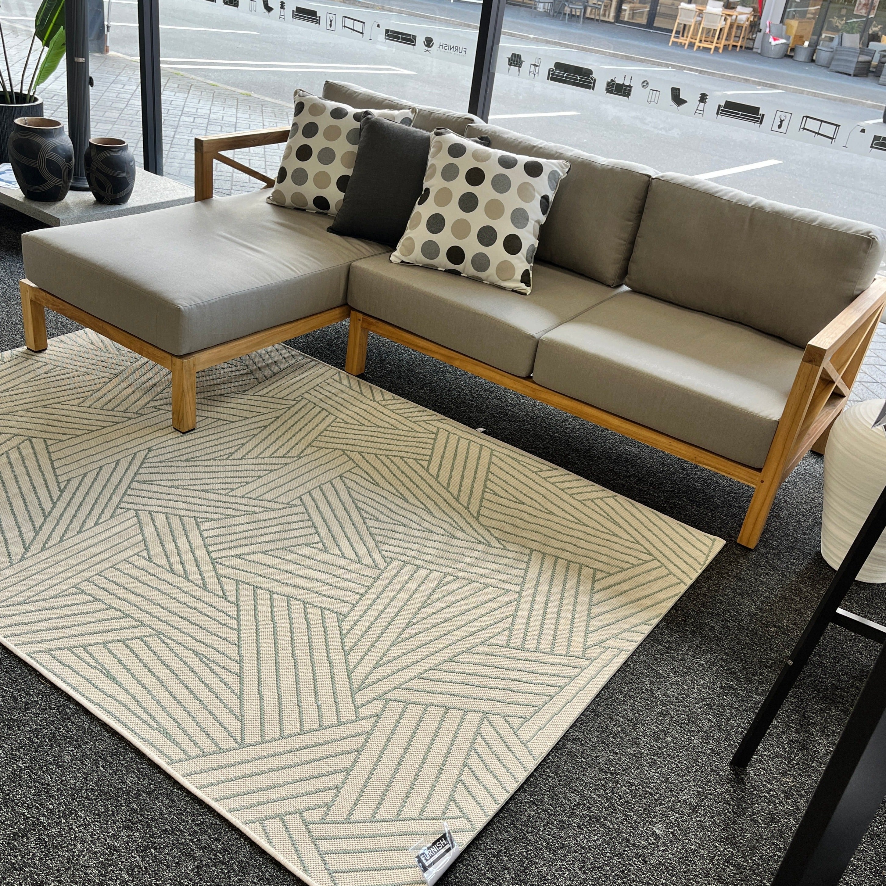 The Hampton outdoor corner sofa features a natural solid teak frame and Urecel quick-dry cushions covered in Sunbrella Natte Grey fabric. The configuration of this Hampton corner sofa is 2 seater on the right-hand side with a chaise on the left-hand side.