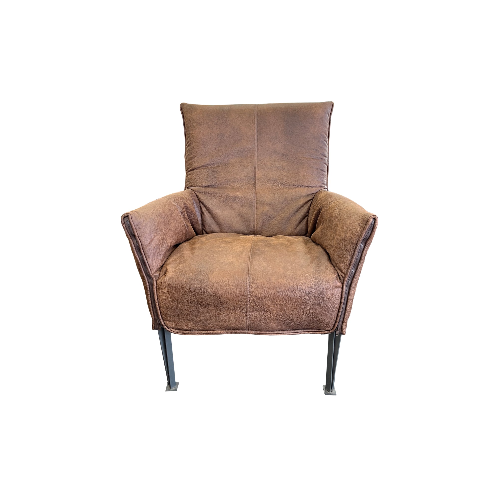The NZ made Hugo chair in Eastwood Dove Fabric has a powder-coated steel frame with a fabric slip-cover and chunky zip detailing.