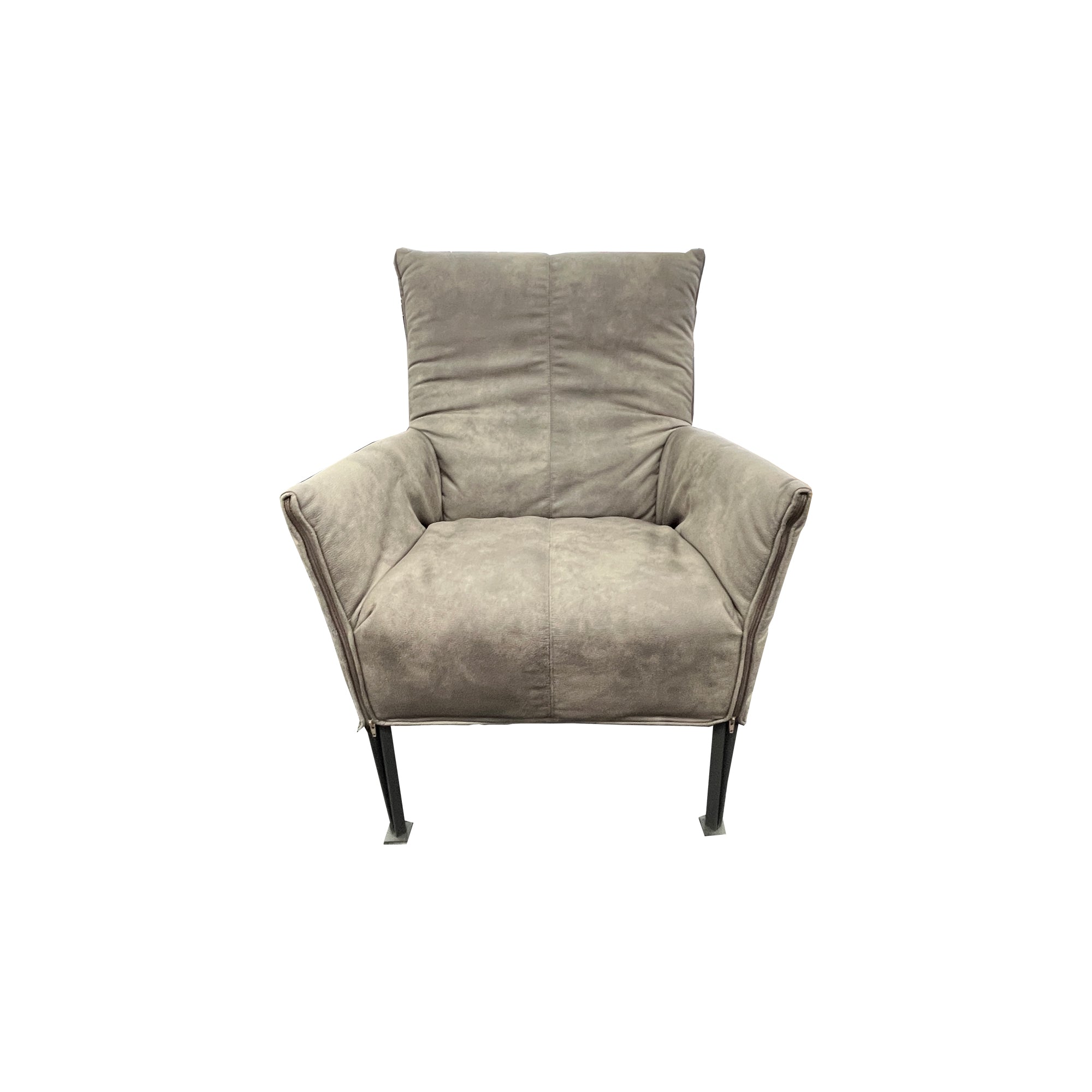 The NZ made Hugo chair in Eastwood Dove Fabric has a powder-coated steel frame with fabric slip-cover and chunky zip detailing.
