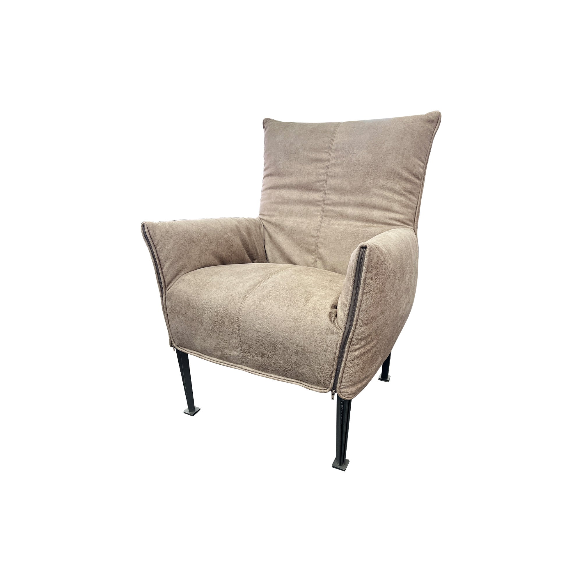 The NZ made Hugo chair in Eastwood Taupe Fabric has a powder-coated steel frame with fabric slip-cover and chunky zip detailing. A matching footstool is also available to order.