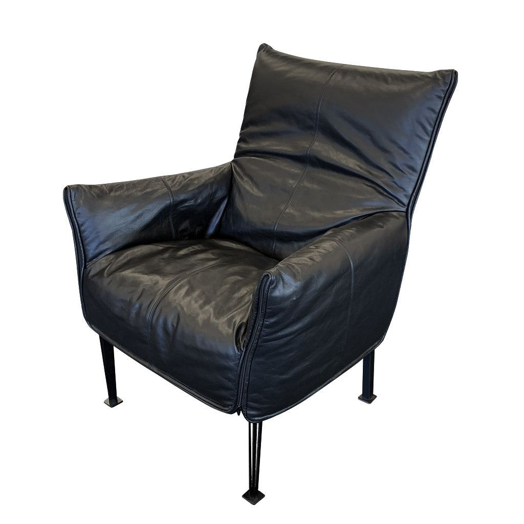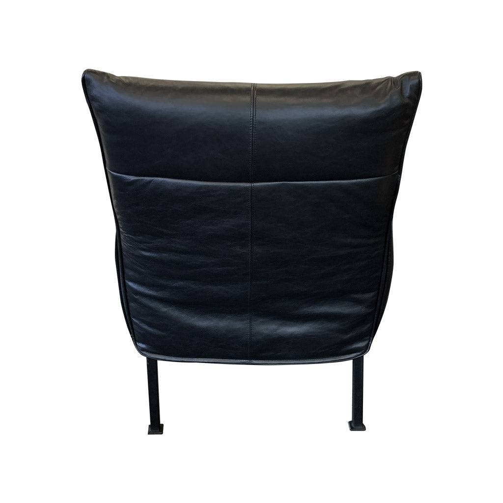 The NZ made Hugo chair in Tasman Settler Black is made in the finest NZ leather. It has a powder coated steel frame with leather slip-cover and chunky zip detailing. Footstool is available to order.