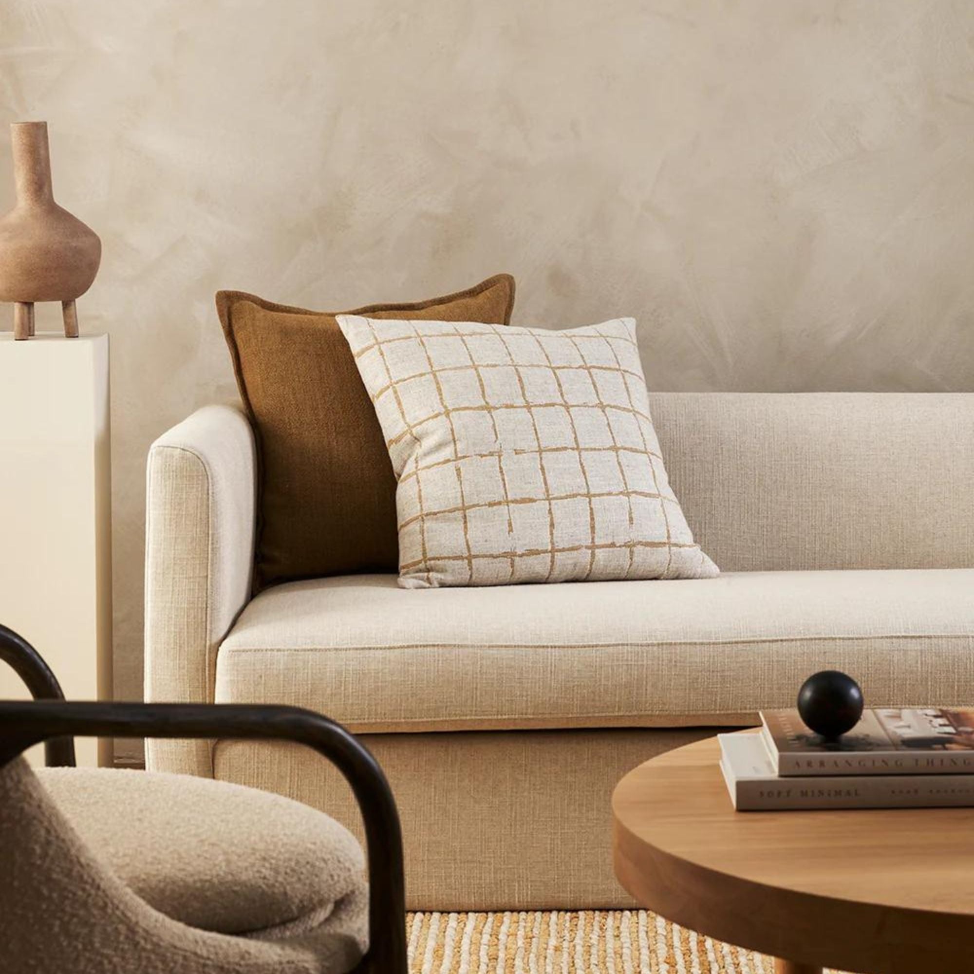 In a warm take on monochrome, classic country style is reinterpreted with a refined and elegant aesthetic. Featuring a ragged grid design in finely woven reverse fabric, the Harrison cushion’s ochre and ivory tones create a composed and considered space for living.