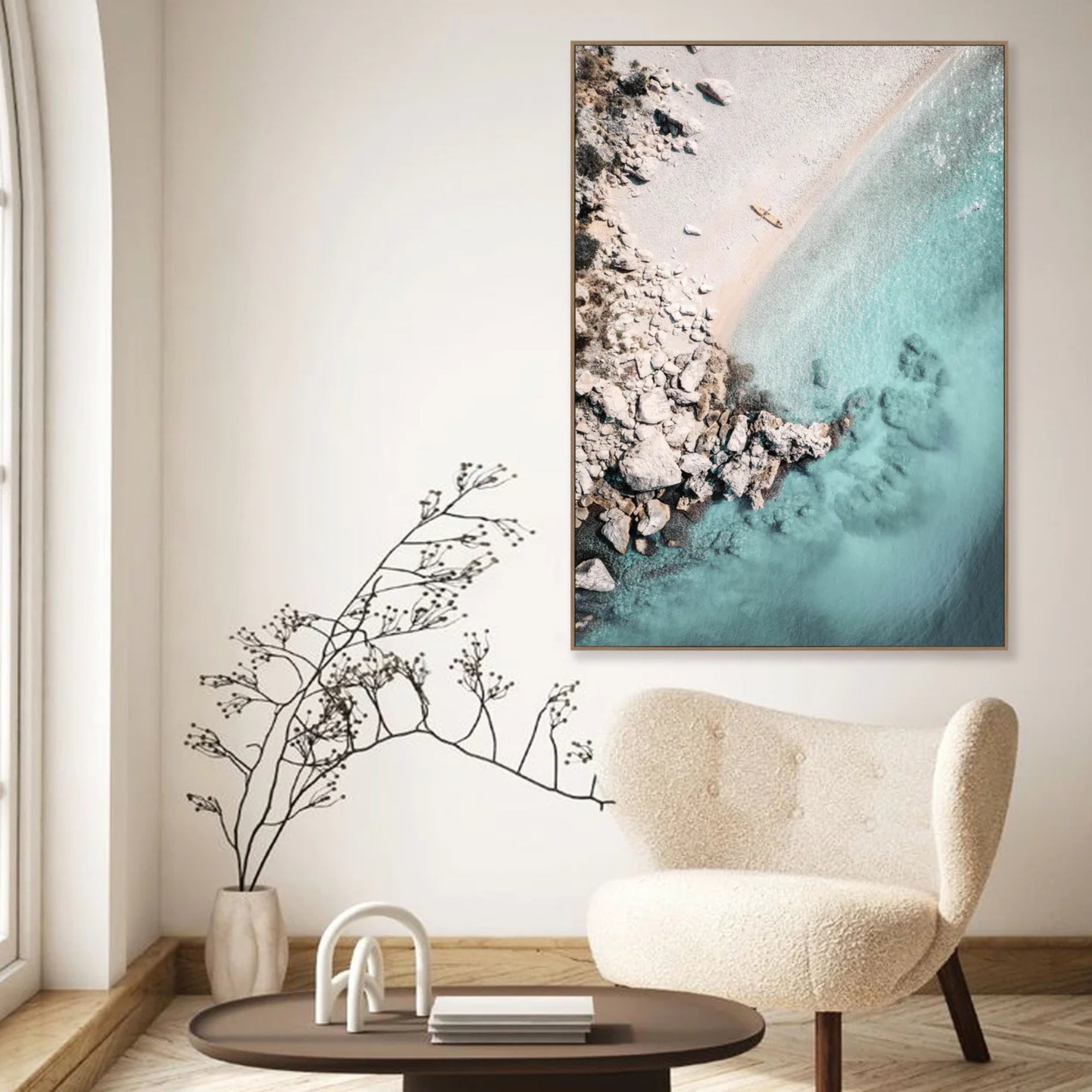 This striking aerial artwork reveals the quiet beauty of a secluded shoreline where textured stone, soft sand and crystal-clear water meet. Gentle turquoise hues blend into deeper coastal blues, while pale rock formations create natural contrast and visual interest along the edge of the beach.
